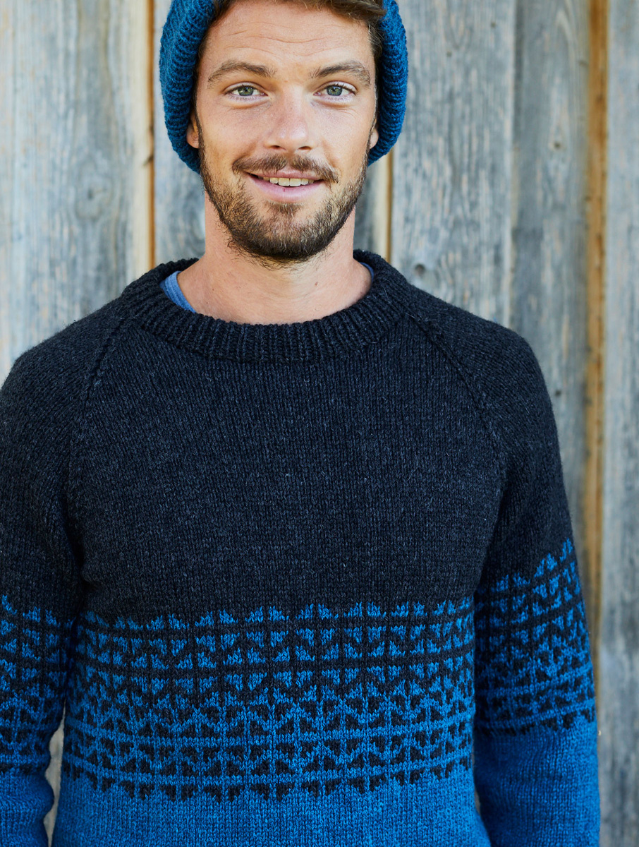 Lana Grossa-Qualität „Landlust Merino 180“ (100% Schurwolle (Merino superwash), LL ca. 180 m/50 g), ca. 300 (350 - 350) g Indigoblau (Fb 226) und ca. 200 (200 - 250) g Anthrazit (Fb 220); Stricknadeln und eine kurze Rundstricknadel Nr. 5