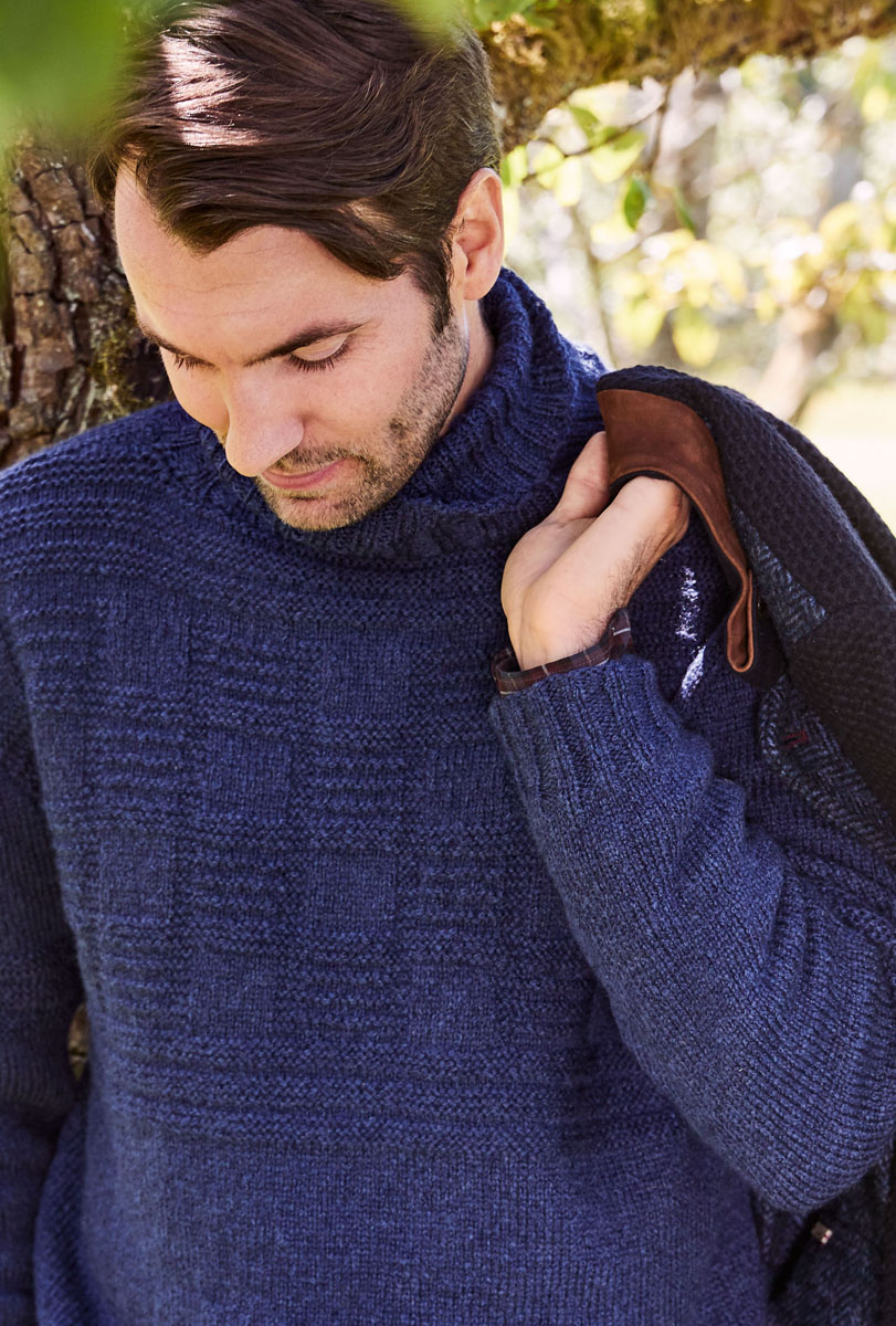 Landlust Merino 180 (100 % Schurwolle (Merino, superwash), LL = ca. 180 m/50 g): 550 (600 – 650) g Dunkelblau (Fb. 208); Stricknadeln Nr. 4 und 4,5, 1 Rundstricknadel Nr. 4, 40 cm lang, 1 Wollhäkelnadel Nr. 3,5