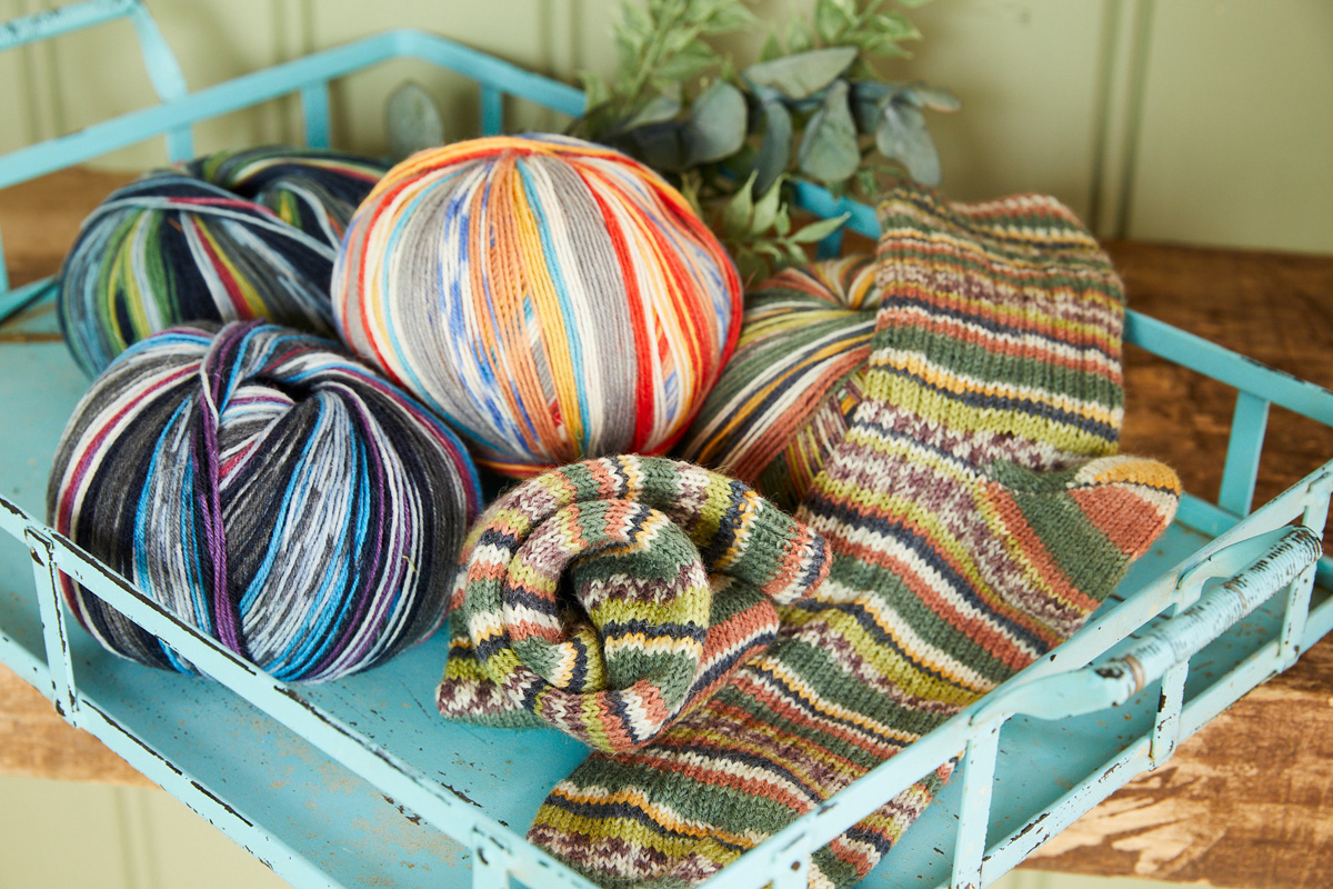 Lana Grossa-Qualität „Landlust - Die Sockenwolle“ (80% Schurwolle Merino, 20% Polyamid, LL ca. 420 m/100 g), 100 g Bunte Bänder (Fb 708); Nadelspiel Nr. 3.