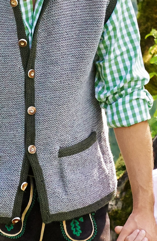 Lana Grossa Qualität „Alpina” (80 % Schurwolle, 20 % Polyamid, waschmaschinenfest, LL = ca. 210 m/100 g): ca. 400 (500 – 500) g grau meliert (Fb. 5) und ca. 100 g Loden (Fb. 7); Stricknadeln Nr. 4,5 und 5, 1 Rundstricknadel Nr. 4,5, 80 cm lang; 6 Metallknöpfe mit Hirschmotiv von Union knopf, Art. 45970, 20 mm Ø, Fb. 83 altsilber.