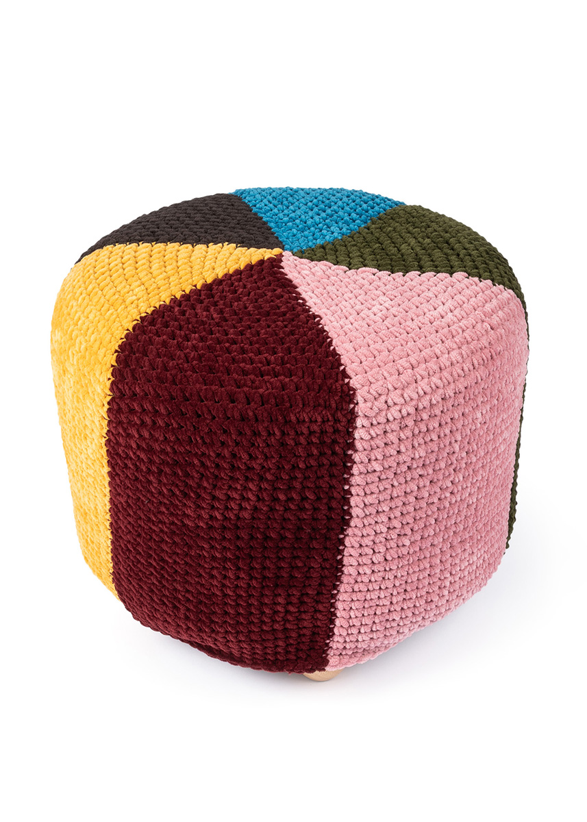 Lana Grossa-Qualität „The Look” (100 % Polyester, LL = ca. 120 m/100 g): je ca. 100 g Safrangelb (Fb. 32), Burgund (Fb. 5), Altrosa (Fb. 4), Dunkeloliv (Fb. 19), Petrolblau (Fb. 28) und Mokka (Fb. 22); 1 Wollhäkelnadel Nr. 7; z. B. 1 WOLTU Hocker mit Stauraum gepolstert, rund, Massivholzbeine, Leinenbezug, ø 39 x 33 cm, cremeweiß über Amazon.