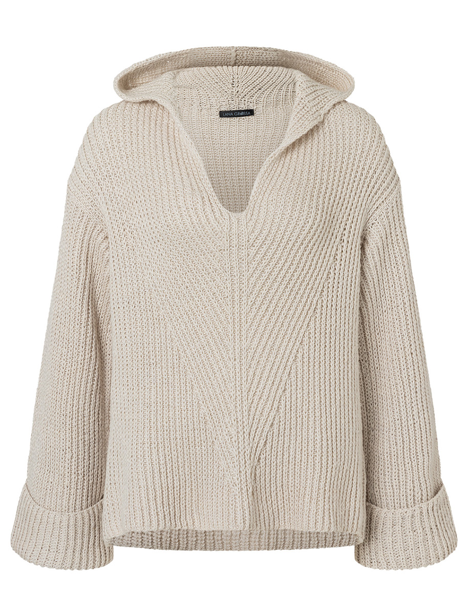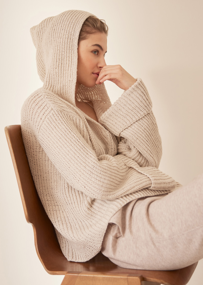 Sanftes Beige, weite Ärmel und ein raffiniertes Halbpatentmuster – fertig ist der Luxus-Hoodie. Dazu eine farblich passende Hose. Weil Ton-in-Ton-Outfits Klasse und eine beruhigende Wirkung haben.