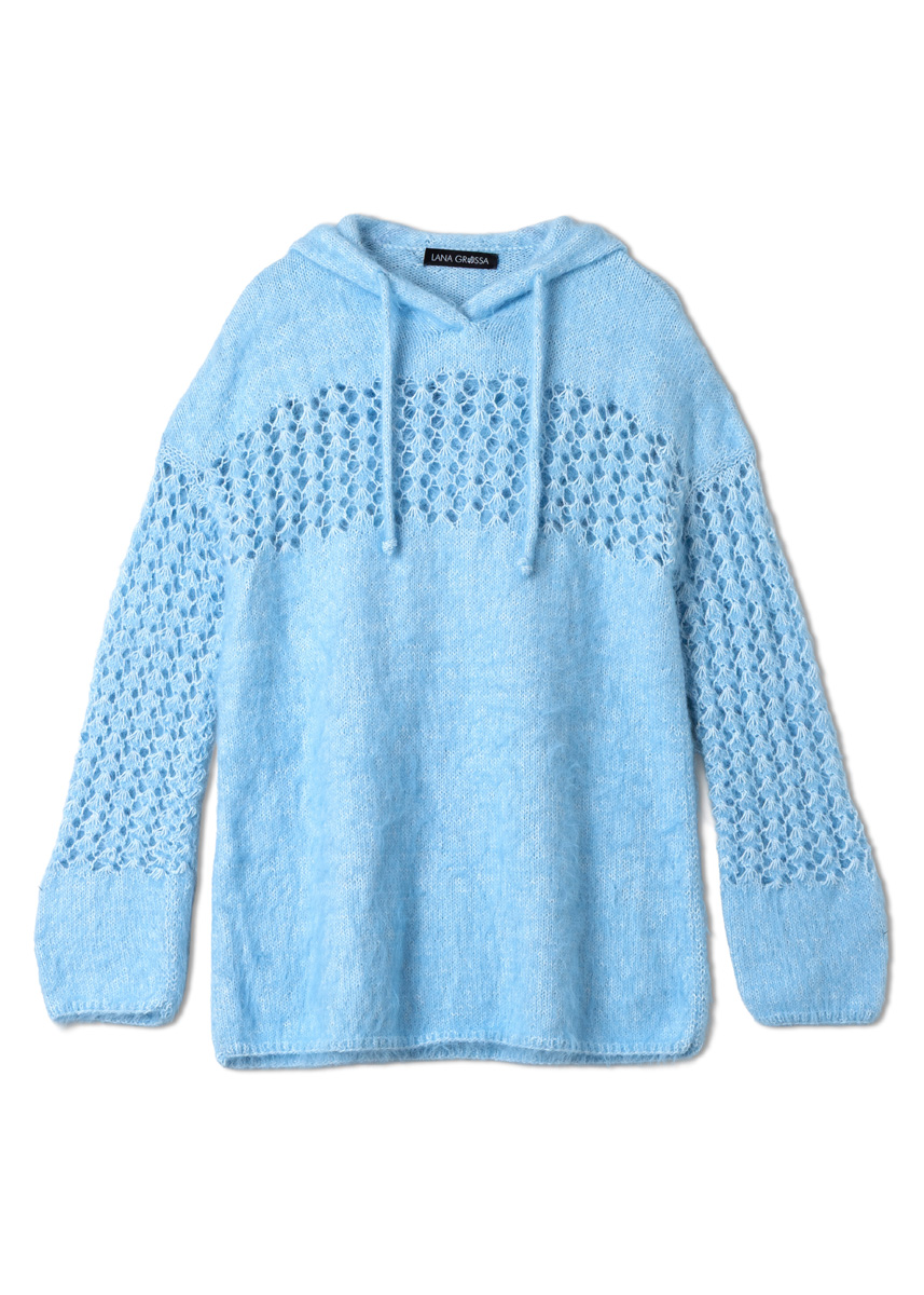 Azzurro ist der Titel eines Songs, der die Sehnsucht nach Sommer beschreibt und „azzurro cielo“ – himmelblau – würde man den hellblau melierten Farbton in Italien nennen. Kein Wunder also, dass wir sofort in Ferienstimmung kommen. Der extravagante HOODIE richtet sich an erfahrene Strickkünstlerinnen oder extrem ehrgeizige Einsteigerinnen.