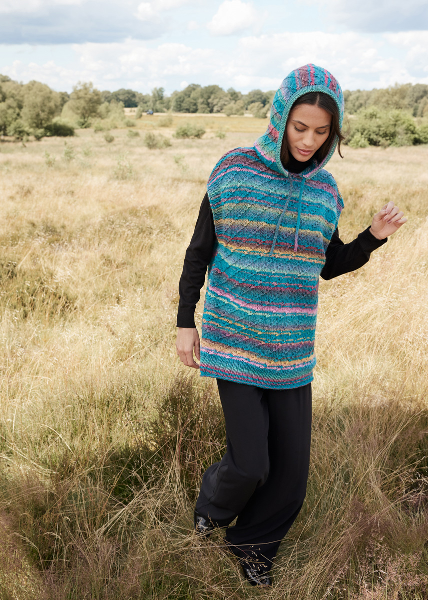 Lana Grossa-Qualität „Gomitolo Magico“ (60 % Schurwolle, 40 % Polyacryl, LL = ca 700 m/200 g): 2 (2 - 2 - 2) = ca 400 (400 - 400 - 400) g Petrol/Seegrün/Grau/Graurot/ Bordeaux/Rosa/Senfgelb/Graubraun (Fb 3024); Stricknadeln Nr 4 und 4,5; kurze Rundstricknadel Nr 4 und 4,5; Zopfnadel; 2 Sockennadeln Nr 4.