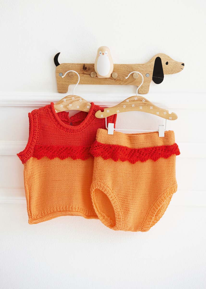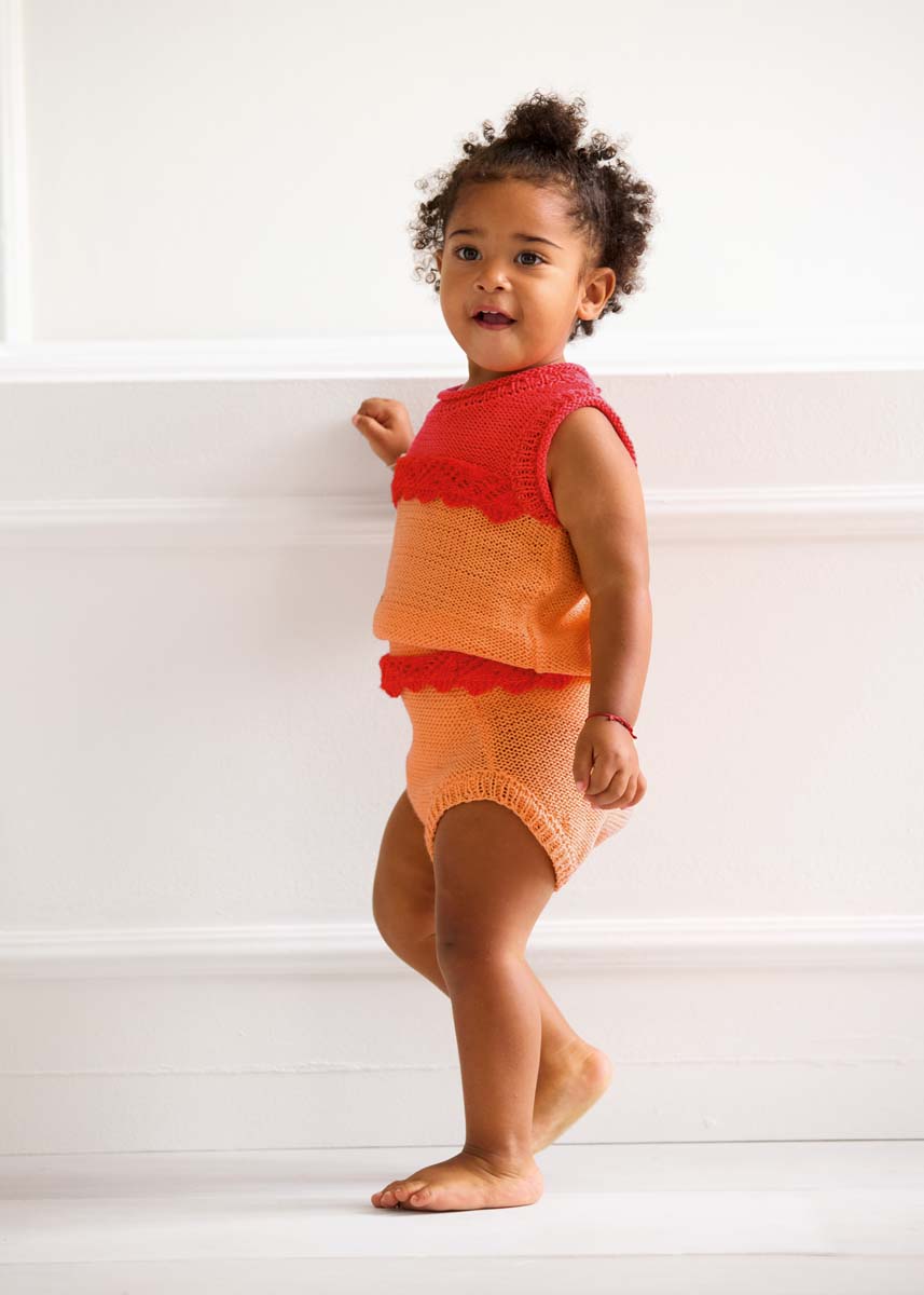 Lana Grossa Campo (65% Baumwolle, 25% Viskose, 10% Leinen; LL = 165 m/50 g): 50 (50/100/100) g Orange (Fb. 14) und 50 g Leuchtendrot (Fb. 16); Lana Grossa Sottile (85% Baumwolle, 15% Schurwolle (Merino); LL = 250 m/50 g): 50 g Leuchtendrot (Fb. 4); je eine Rundstricknadel 3,5 mm und 4 mm; 8 entfernbare Markierer (alternativ Sicherheitsnadeln); Gummiband mit einer Breite von 3,5 cm, 30 (32/36/40) cm lang.