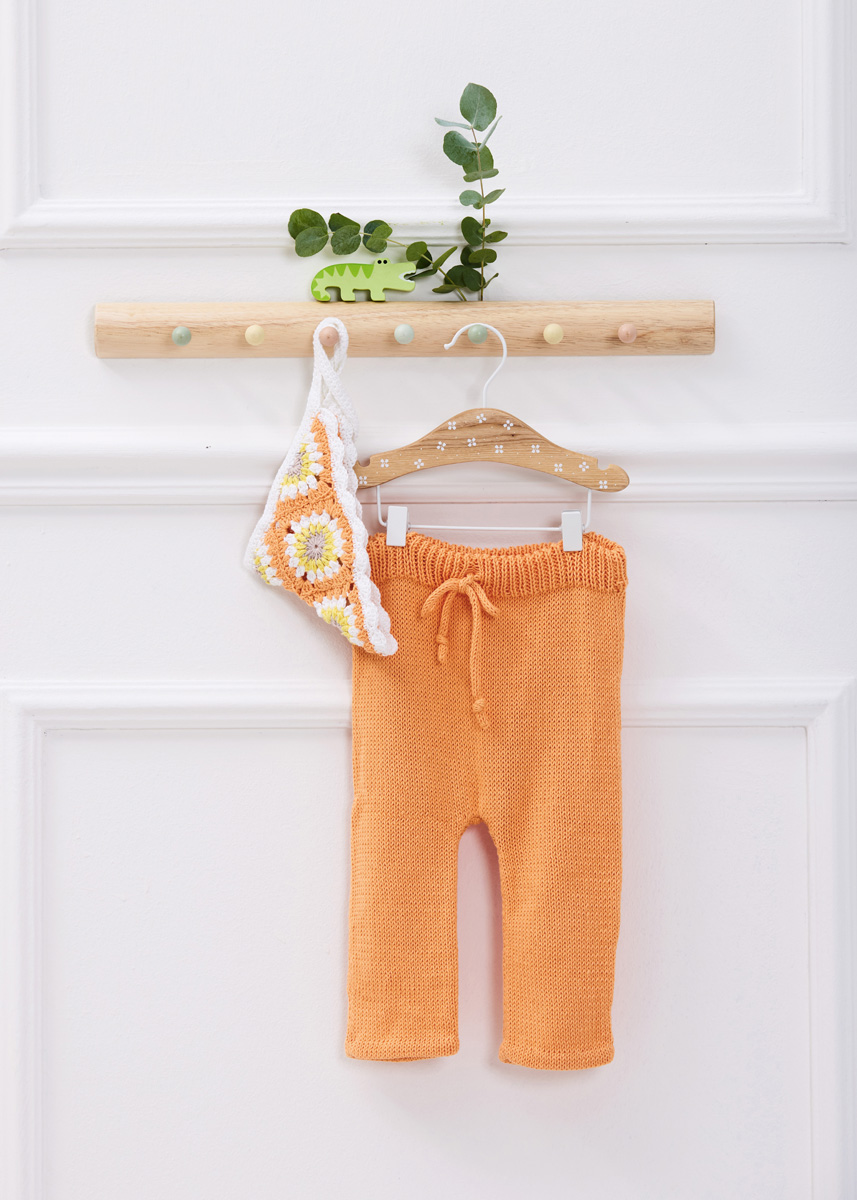 Lana Grossa-Qualität „Elastico“ (96 % Baumwolle, 4 % Polyester (Elité); Lauflänge = 160 m / 50 g): 100 (150/200/250) g Orange (Fb 169); je eine Rundstricknadel 3,5 mm und 4 mm; Strickliesel (oder 2 Spielnadeln 4 mm, um die Kordel als I-Cord zu str); Gummiband, 2,5 cm breit.