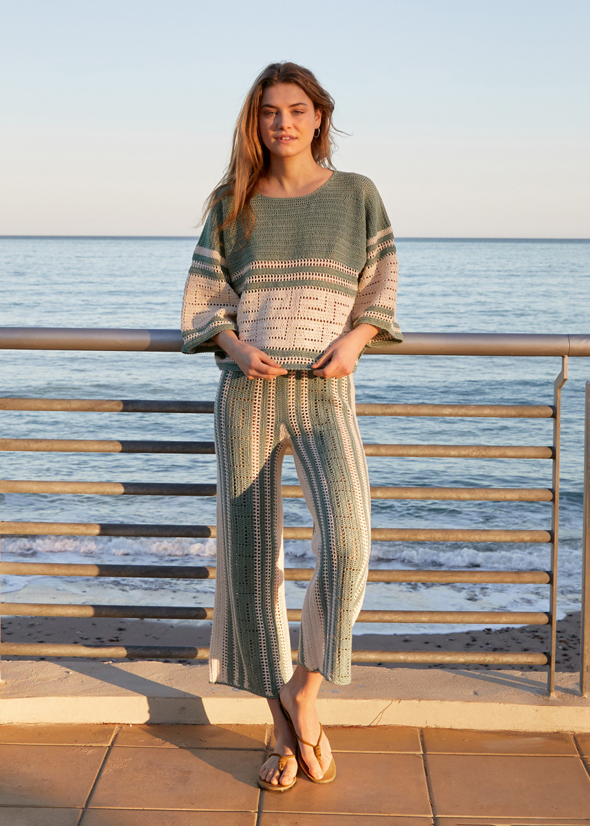 Weich, leicht und lässig – eine Kombi, die man nie wieder ausziehen will. Gehäkelt wird im Filetmuster, das sich hier grafisch kühl präsentiert – SUMMER CASHMERE.
