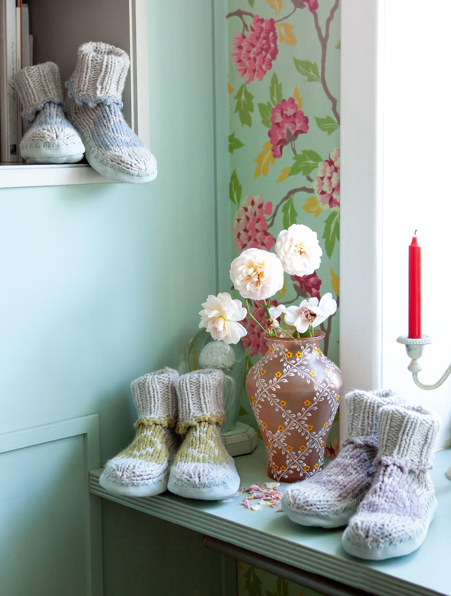 Kommen immer gut an: die bestickten Strick-Hausschuhe mit romantischen Häkelblenden am Umschlag.
