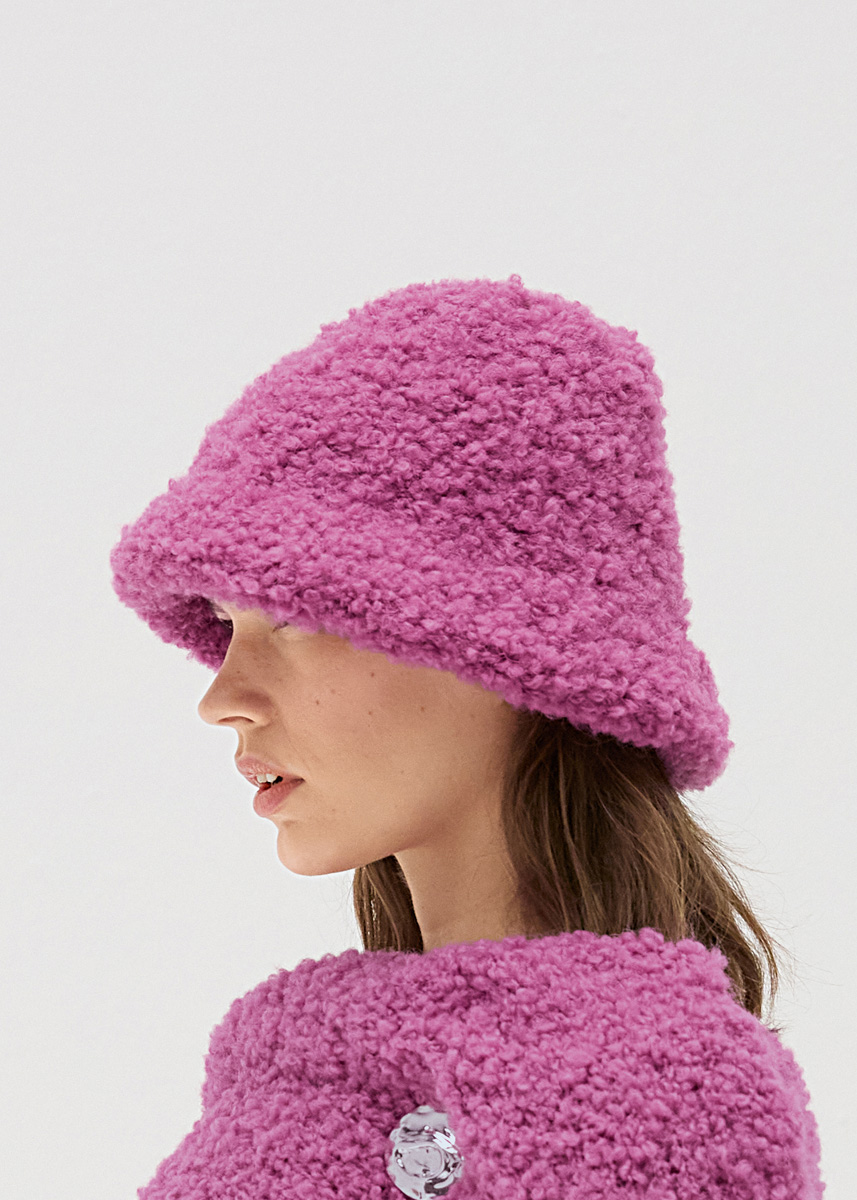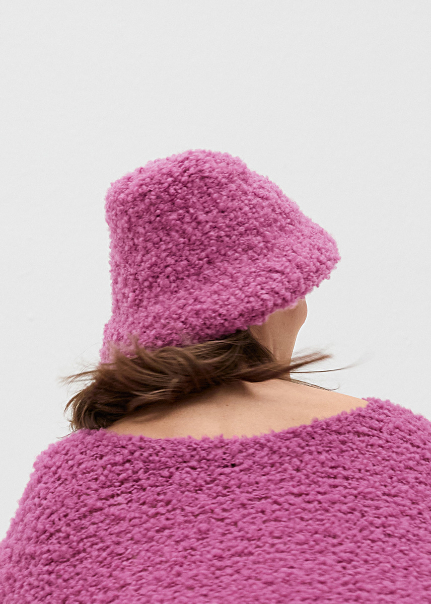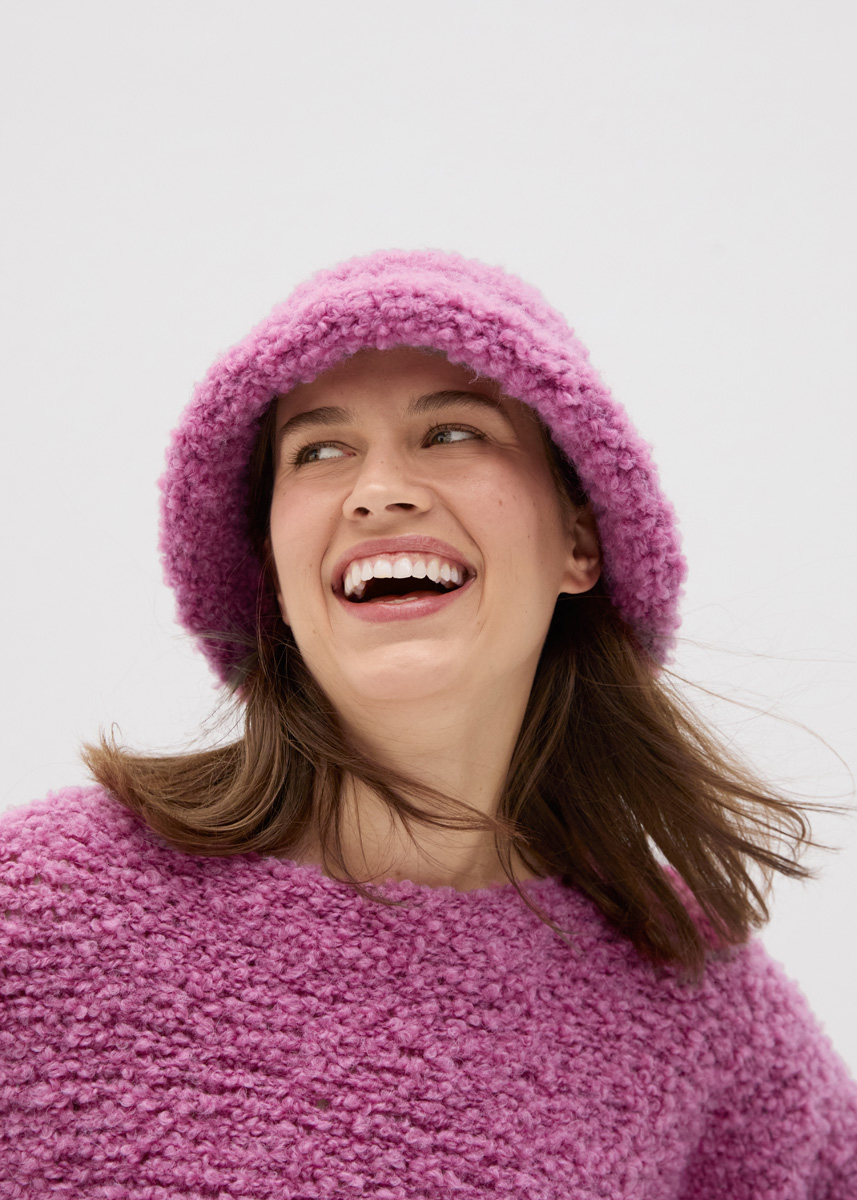Lana Grossa „Orsetto“ (60% Schurwolle (Merino), 40% Alpaka (superfine), LL = 75 m/50 g): 100 g Veilchenrosa (Fb 4); Rundstrick-Nd und Nadelspiel Nr 8; Hilfs-Nd; Maschenmarkierer, Kontrastfaden.