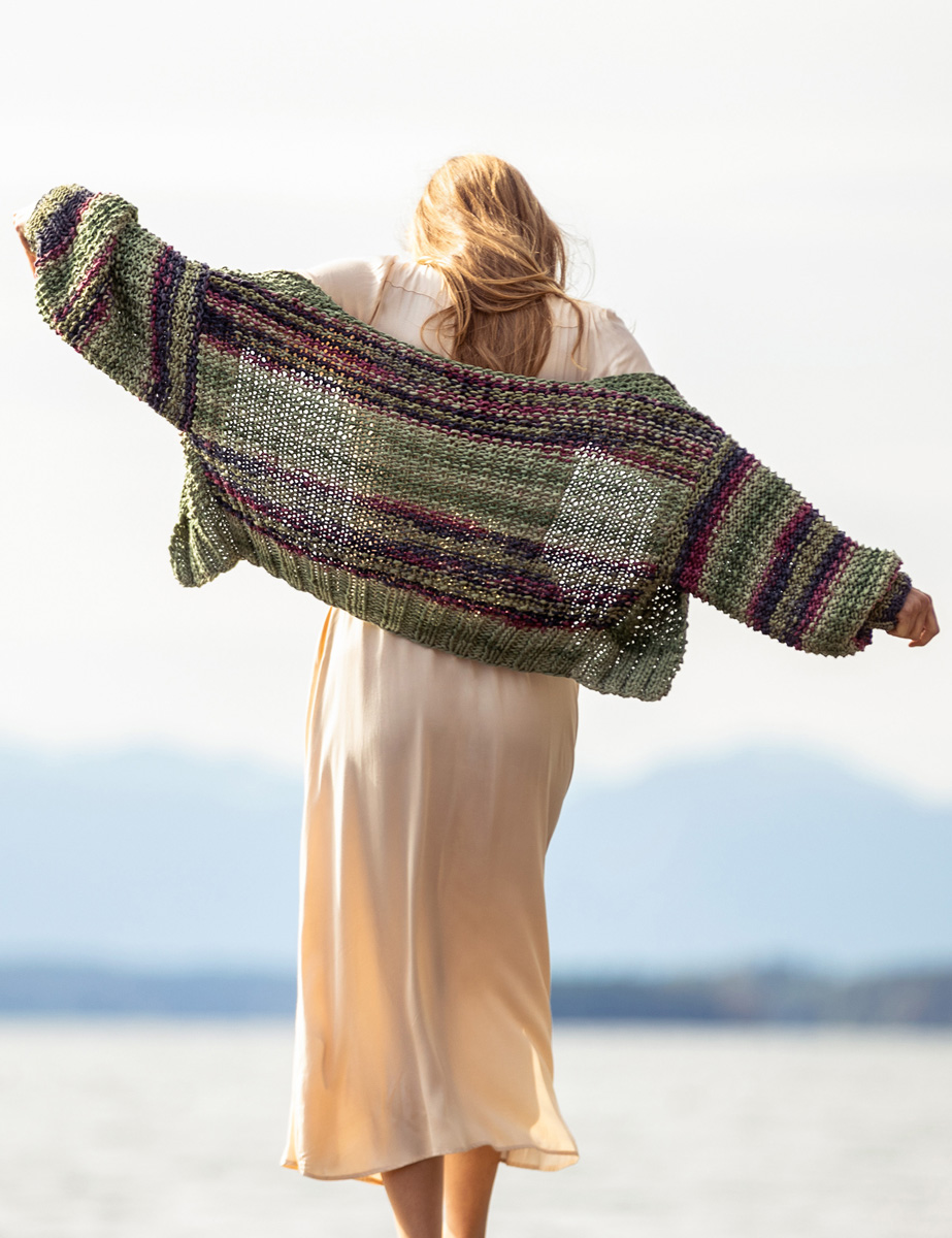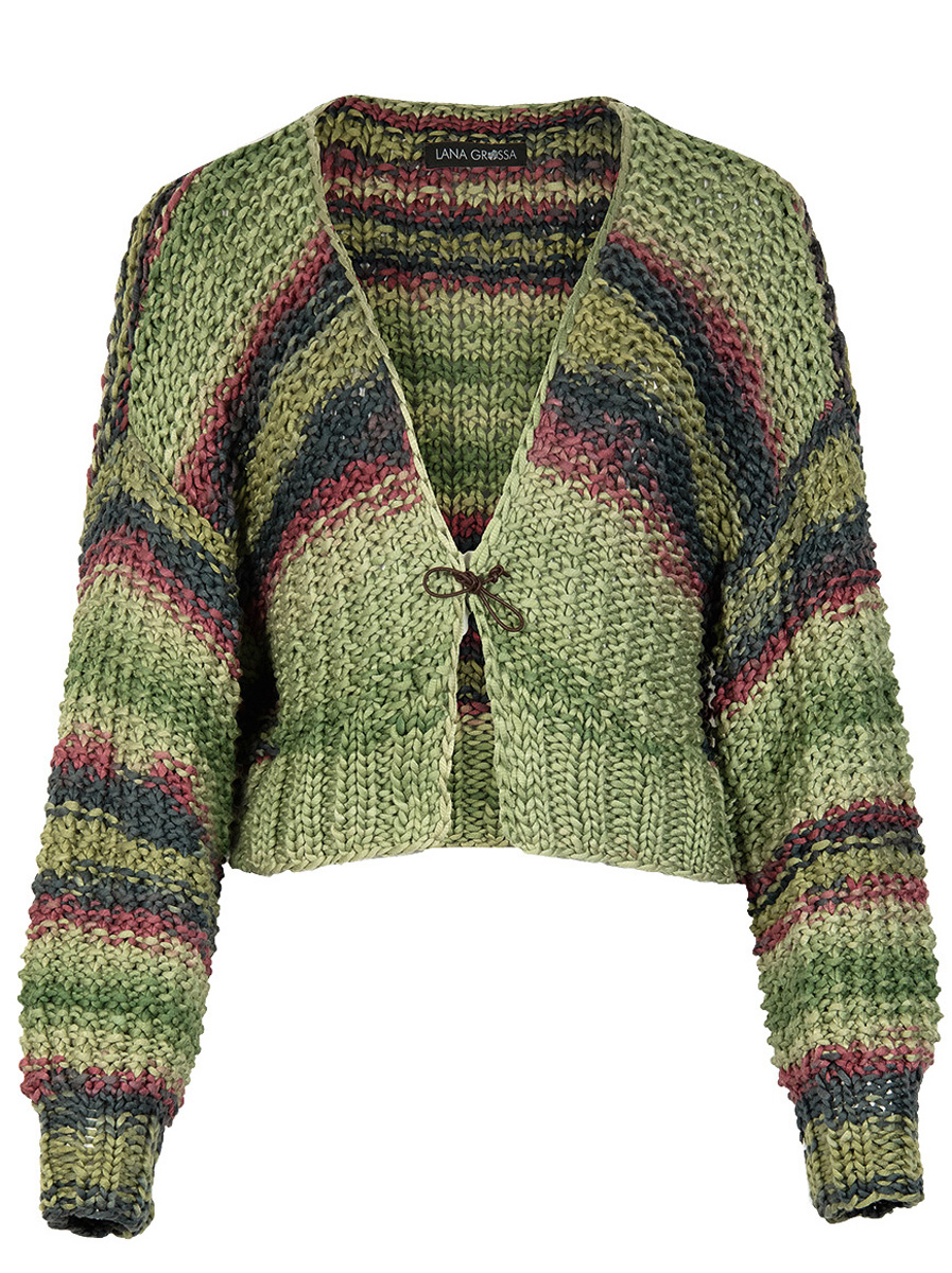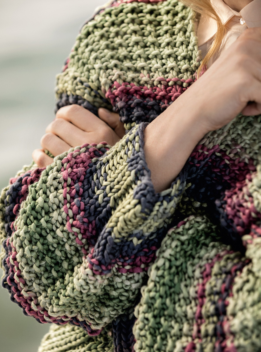 Lana Grossa About Berlin Bulky Print (50% Baumwolle, 50% Micromodal, Lauflänge 47 m/50 g), 600 (650 – 700) g Schilfgrün/Anthrazit/ Beere/Graugrün (Fb 104); Stricknadeln Nr. 9 und 10, 1 Häkelnadel Nr. 8.