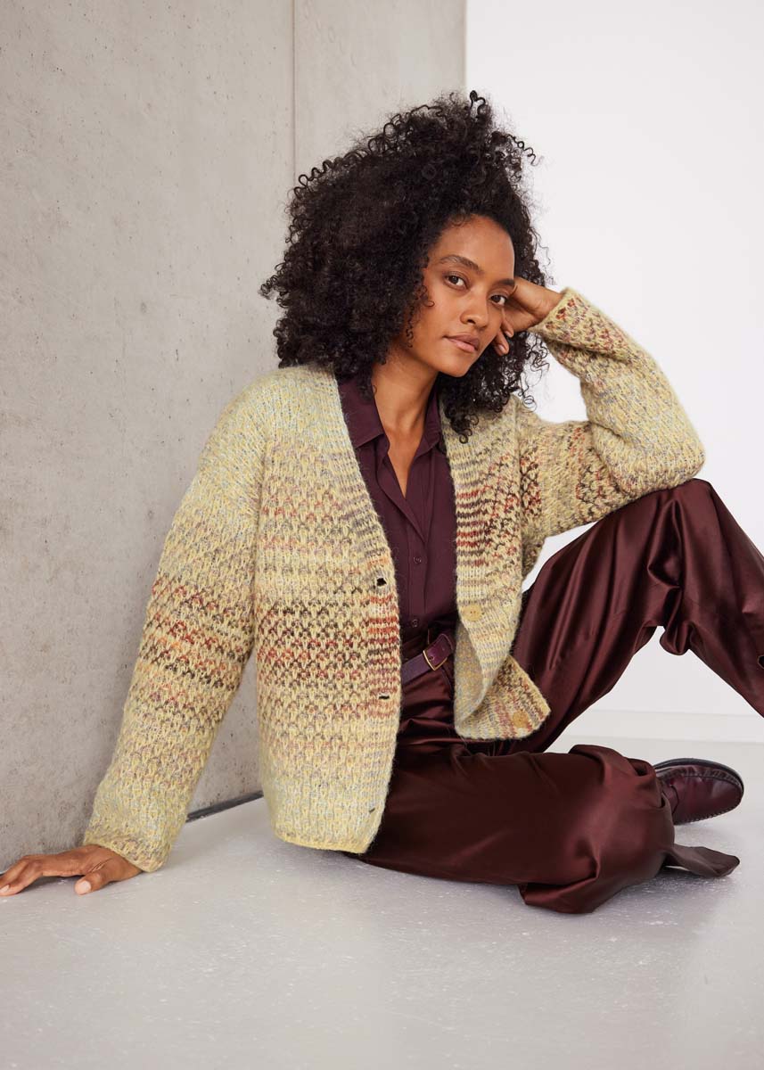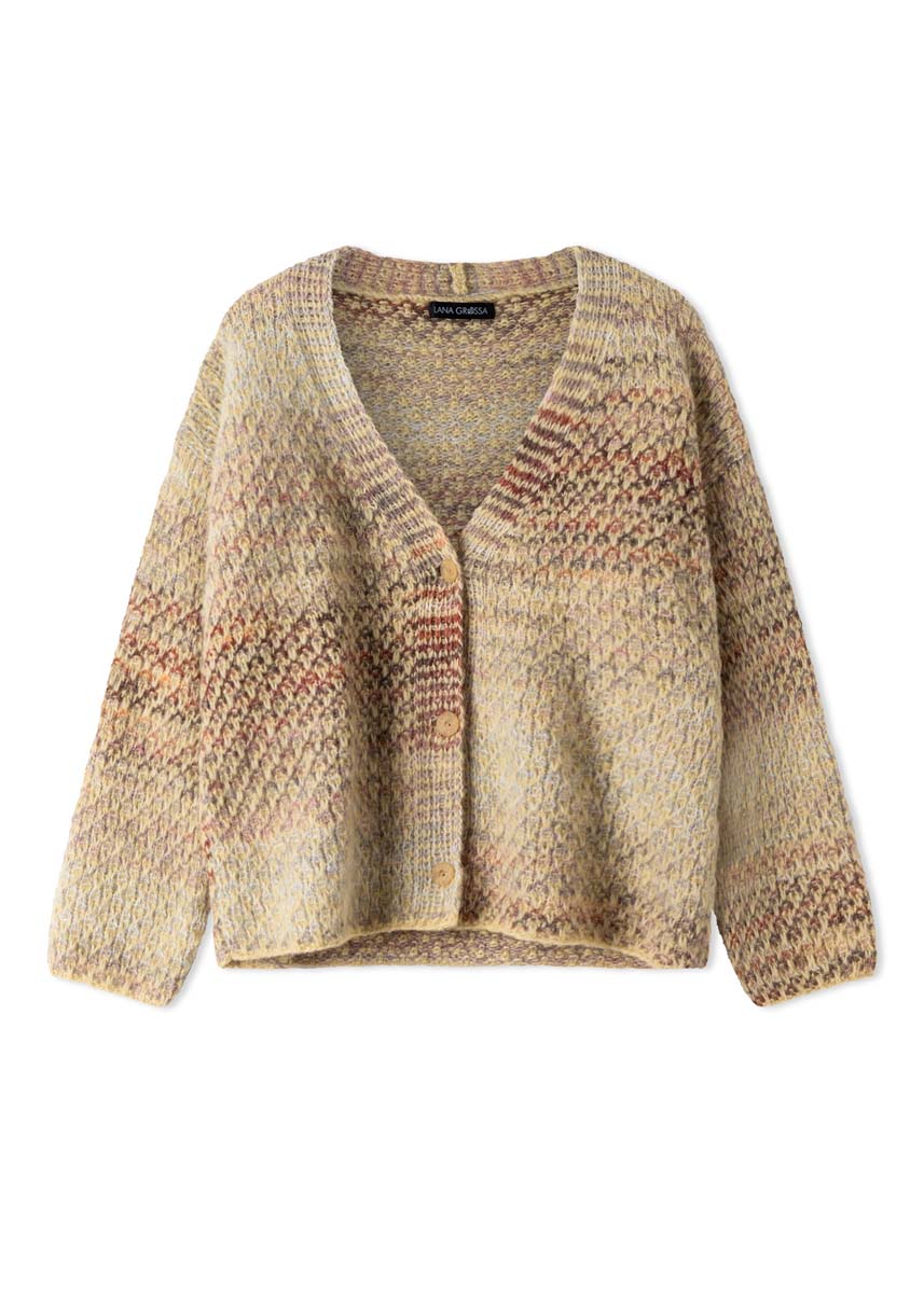 Lana Grossa Airy (42% (Baby) Alpaka, 40% Baumwolle, 18 % Schurwolle (Merino extrafein), LL = ca. 170 m/50 g), 200 (250 - 300) g in Vanille (Fb 18) und Lana Grossa Picasso (36% Schurwolle (Merino extrafein), 36% (Baby) Alpaka 28% Polyamid, LL = ca. 210 m/50 g), 150 (150 - 200) g in Beige/ Rosa/Hellgrau/Weiß/Nougat/Sandbeige/Camel (Fb 17); Stricknd Nr. 6; 3 Knöpfe, Größe ca. 22 mm Ø; 2 Hilfsnd zum M stilllegen.