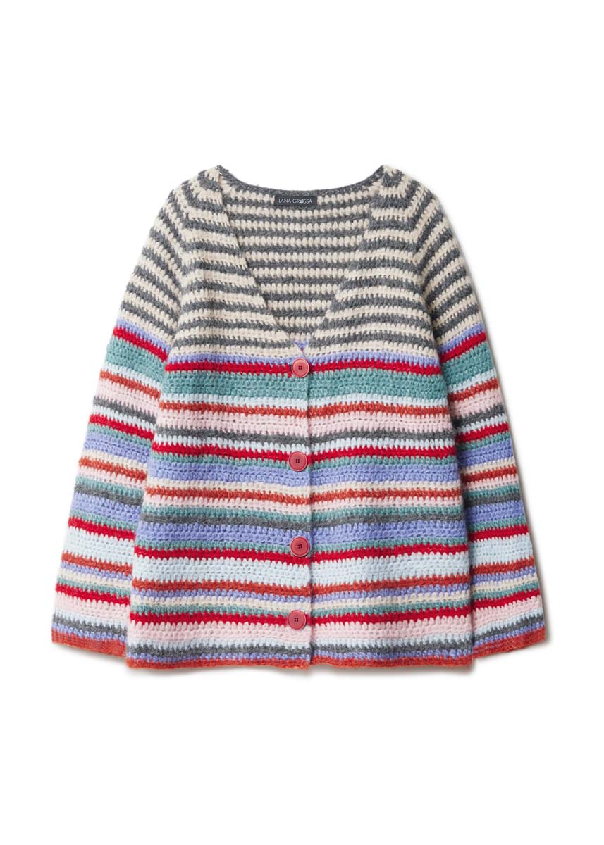 Zusammen stark: das Doppel aus einem fluffig-warmen Alpakagemisch. Die Jacke wird top-down gehäkelt, was die Ringel auf eine Linie bringt. Dazu gibt es eine Bommelmütze, die, wie die Jacke, aus halben Stäbchen besteht.