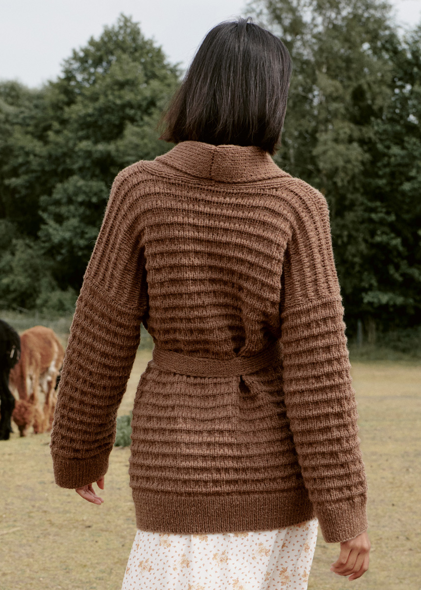 Ein Biesenmuster mit Hebemaschen bringt Struktur in die klassische Jacke. Sie hat eine einfache, gerade Form. Außerdem wird sie geknöpft und funktioniert dadurch auch ohne Gürtel.