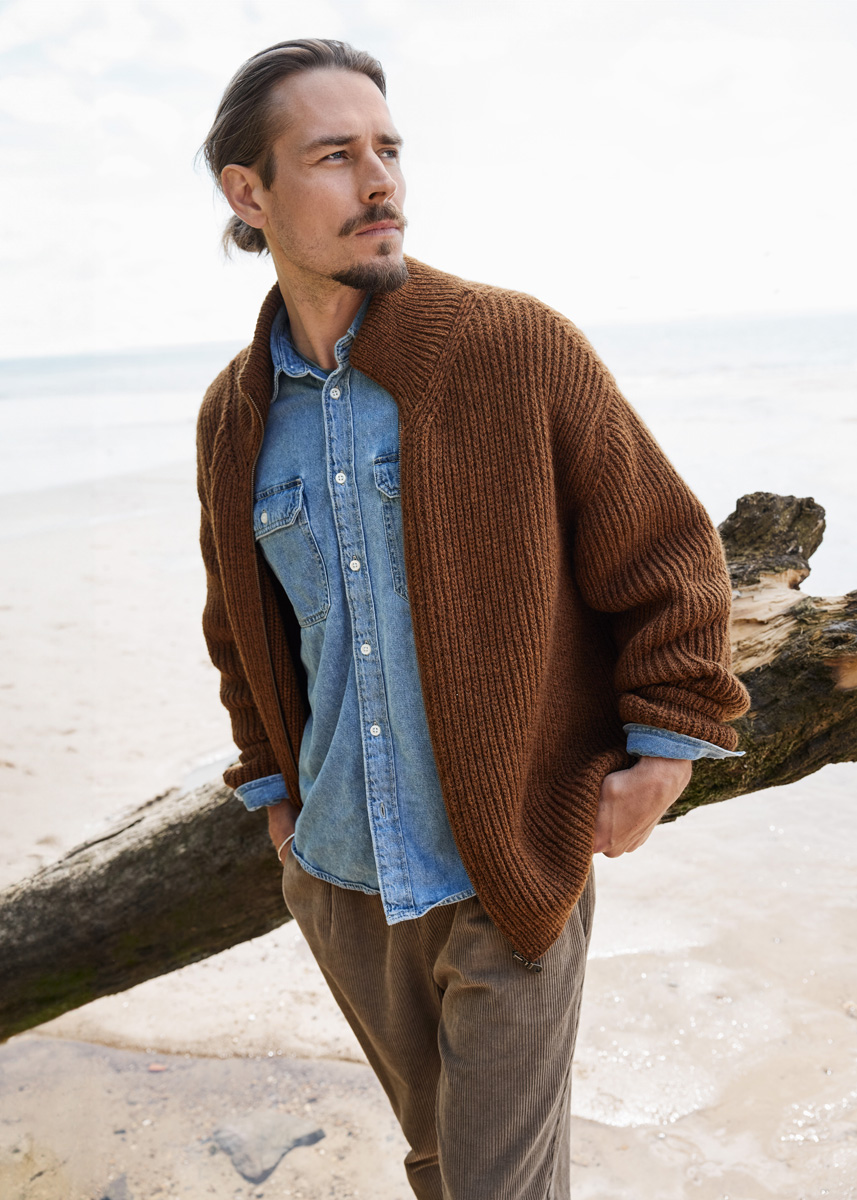 m/50 g), 1000 (1050 – 1100) g Schokobraun (Fb. 104); Stricknadeln Nr. 3 und 4, 1 Rundstricknadel Nr. 3, 40 cm lang, Reißverschluss von PRYM, Metall teilbar, M5, Fb. 884, 65 (65 – 70) cm lang.