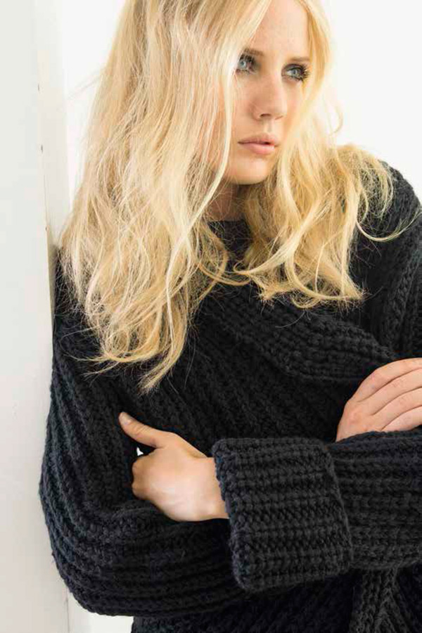 Lana Grossa-Qualität "Alta Moda Cashmere" (80 % Schurwolle (Merino), 15 % Kaschmir, 5 % Polyamid, Laufänge = ca. 90 m/50 g): ca. 700 (750) g Schwarz (Fb. 12); Stricknadeln Nr. 9 und 10.