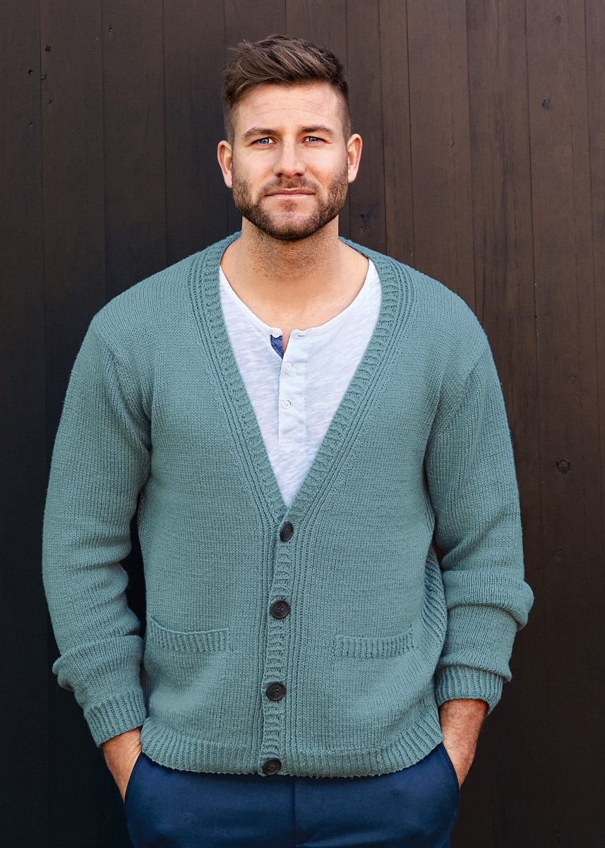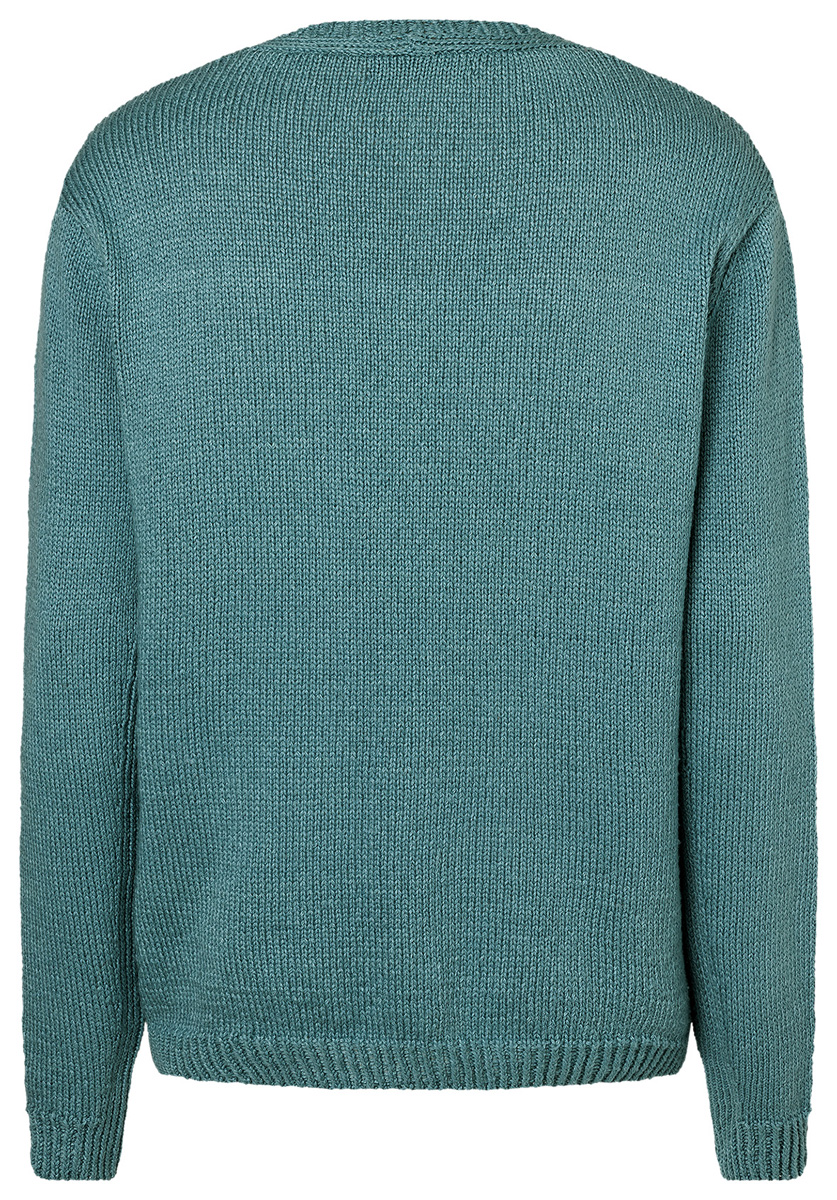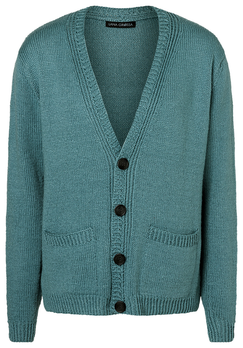 Lana Grossa Alta Moda Cotolana (45% Schurwolle (Merino), 45% Pima Baumwolle, 10% Polyamid, Lauflänge 150 m/50 g), 650 (700 – 750) g Pastelltürkis (Fb 12); Stricknadeln Nr. 3,5 und 4, 1 Rundstricknadel Nr. 3,5, 100 cm lang, 4 Knöpfe von UNION KNOPF, Art. 39145, Fb 78, Gr. 25 mm.