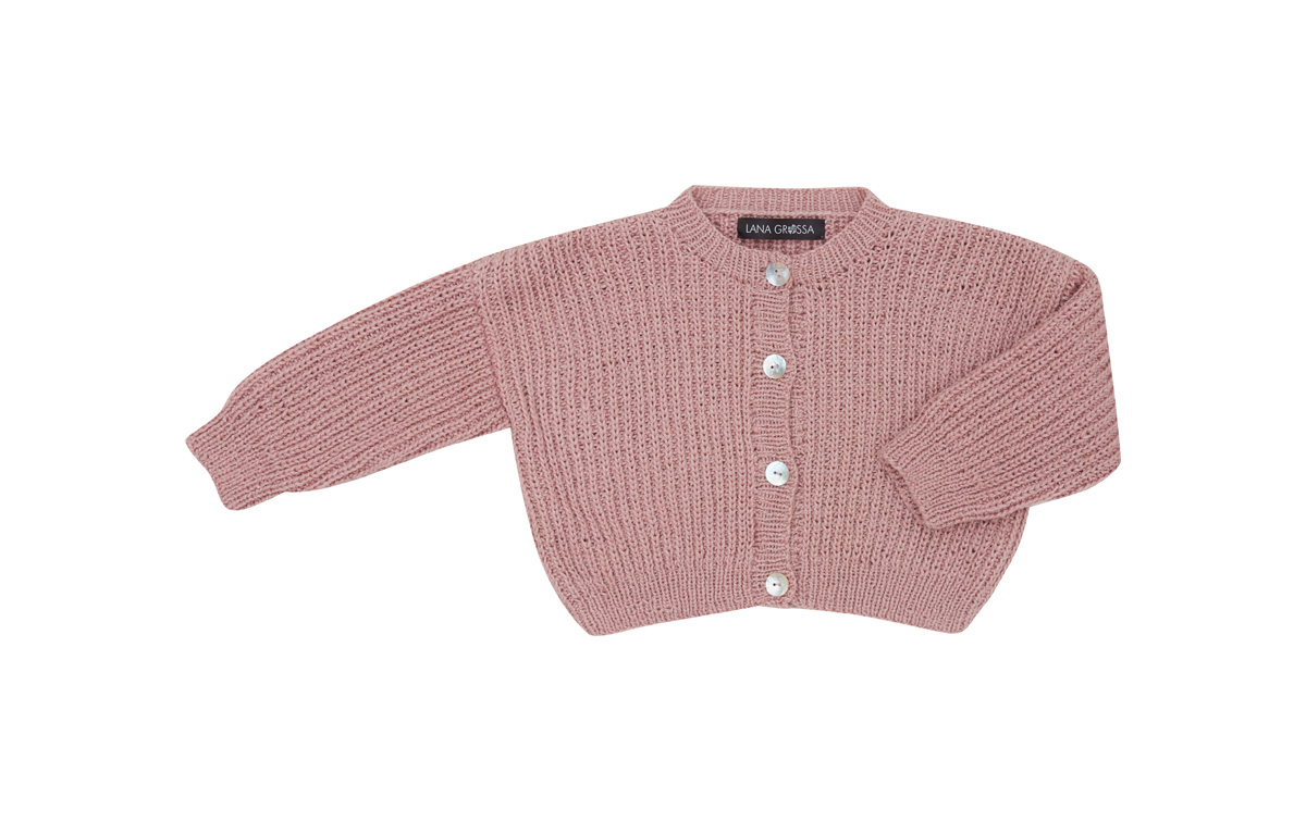Lana Grossa Alta Moda Cotolana (45% Schurwolle Merino, 45% Pima Baumwolle, 10% Polyamid, Lauflänge 150 m/50 g), 250 (300 – 300) g Altrosa (Fb 07); Stricknadeln Nr. 3 und 4, 1 Rundstricknadel Nr. 3, 60 cm lang, 4 Knöpfe von UNION KNOPF, Art. 37604, Fb 12, Gr. 18 mm.