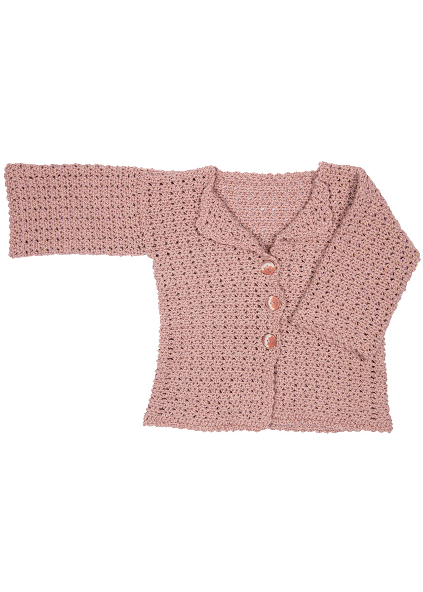 Lana Grossa Alta Moda Cotolana (45 % Baumwolle Pima, 45 % Schurwolle (Merino), 10 % Polyamid, Lauflänge 150 m/50 g) 200 (250/250) g Altrosa (Fb 7); Häkelnadel Nr. 3,5; drei Knöpfe mit 18 mm Ø.