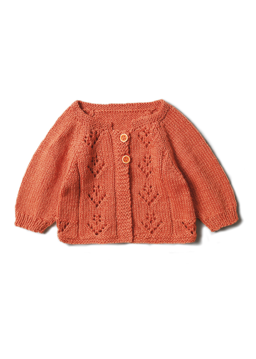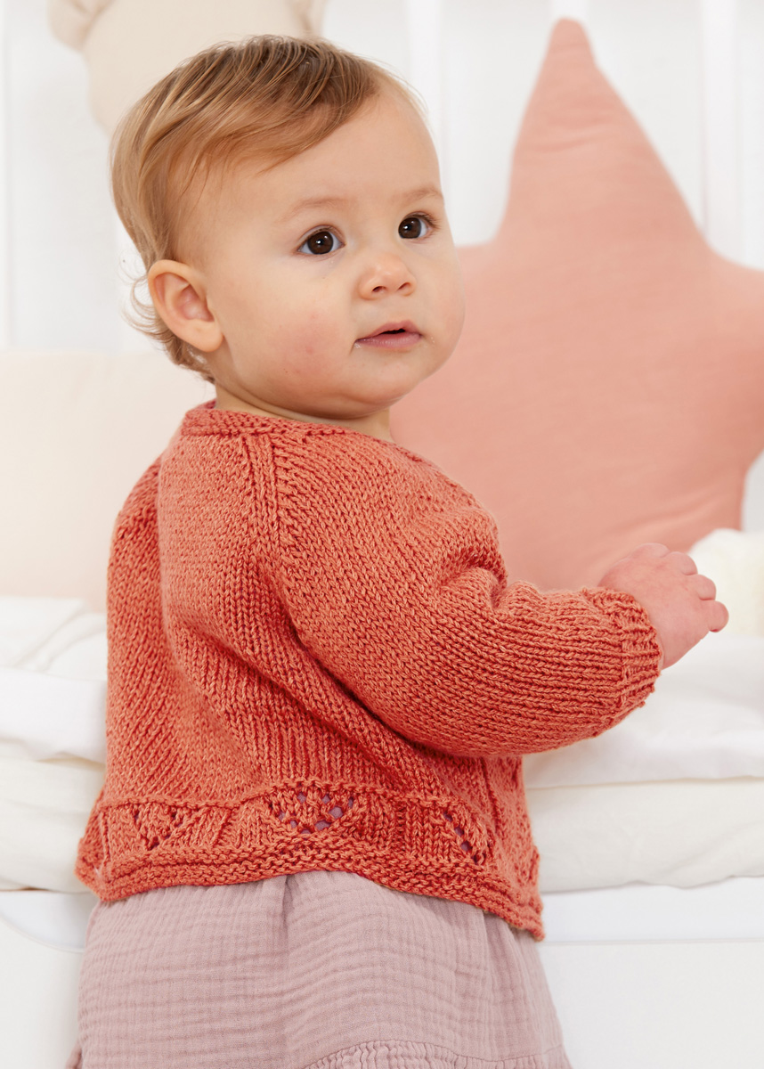 Lana Grossa Alta Moda Cotolana (45 % Schurwolle (Merino), 45 % Baumwolle (Pima), 10 % Polyamid, Lauflänge = 150 m/50 g): 100 (100/150) g Tomatenrot (Fb 33); Stricknadeln Nr. 3,5; Rundstricknadel Nr. 3,5; zwei Knöpfe mit 15 mm Ø.
