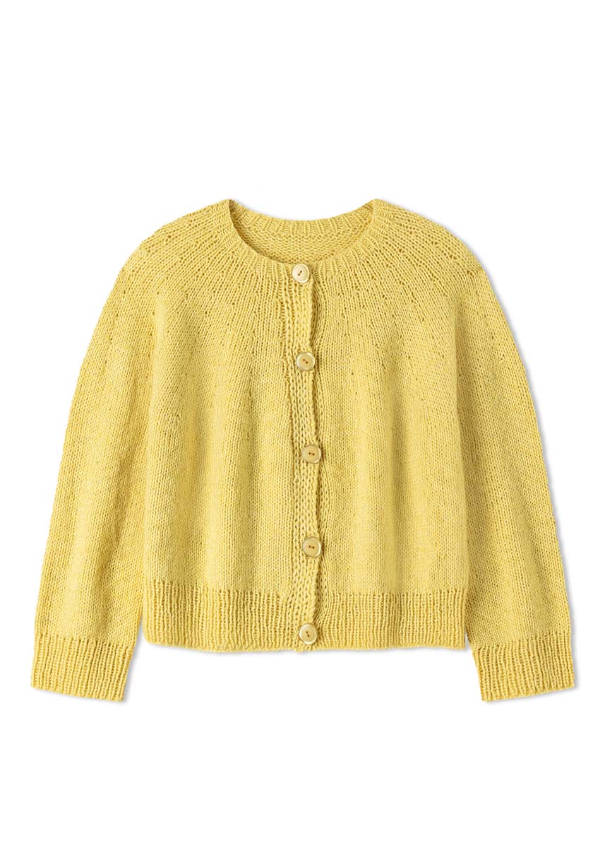 Lana Grossa Alta Moda Cotolana (45% Schurwolle Merino, 45% Pima Baumwolle, 10% Polyamid, Lauflänge 150 m/50 g), 300 (350 – 400) g Hellgelb (Fb. 61) und Lana Grossa Soffio (60% Schurwolle (Merino superfein), 30% Bio Baumwolle, 10% Cashmere, Lauflänge 215 m/25 g), 100 (125 – 150) g Hellgelb (Fb. 27); je 1 Rundstricknadel Nr. 4, 40 und 80 cm lang, je 1 Rundstricknadel Nr. 6, 40, 60 und 80 cm lang, 5 Knöpfe von UNION KNOPF, Fb Hellgelb, Ø 22 mm.