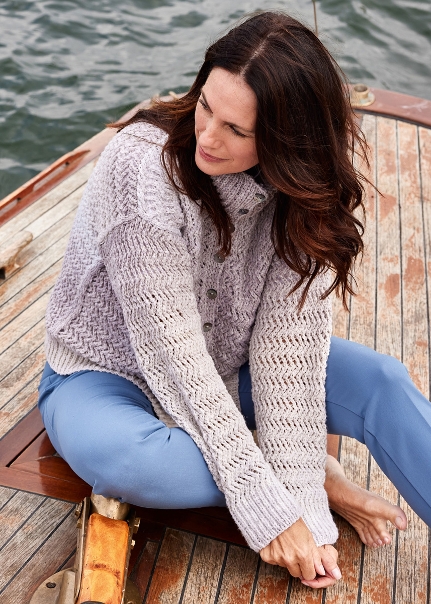 Lana Grossa Amoroso (33% Schurwolle, 32% Polyacryl, 14% Seide, 14% Baumwolle, 7% Polyamid, Lauflänge 400 m/100 g), 400 (400 – 500) g Natur/Grège/Taupe/Graubraun (Fb 14); Stricknadeln Nr. 4 und 5, 1 Rundstricknadel Nr. 4, 40 cm lang, 10 Perlmuttknöpfe von UNION KNOPF, Art. 37604, Fb 12, Gr. 15 mm.