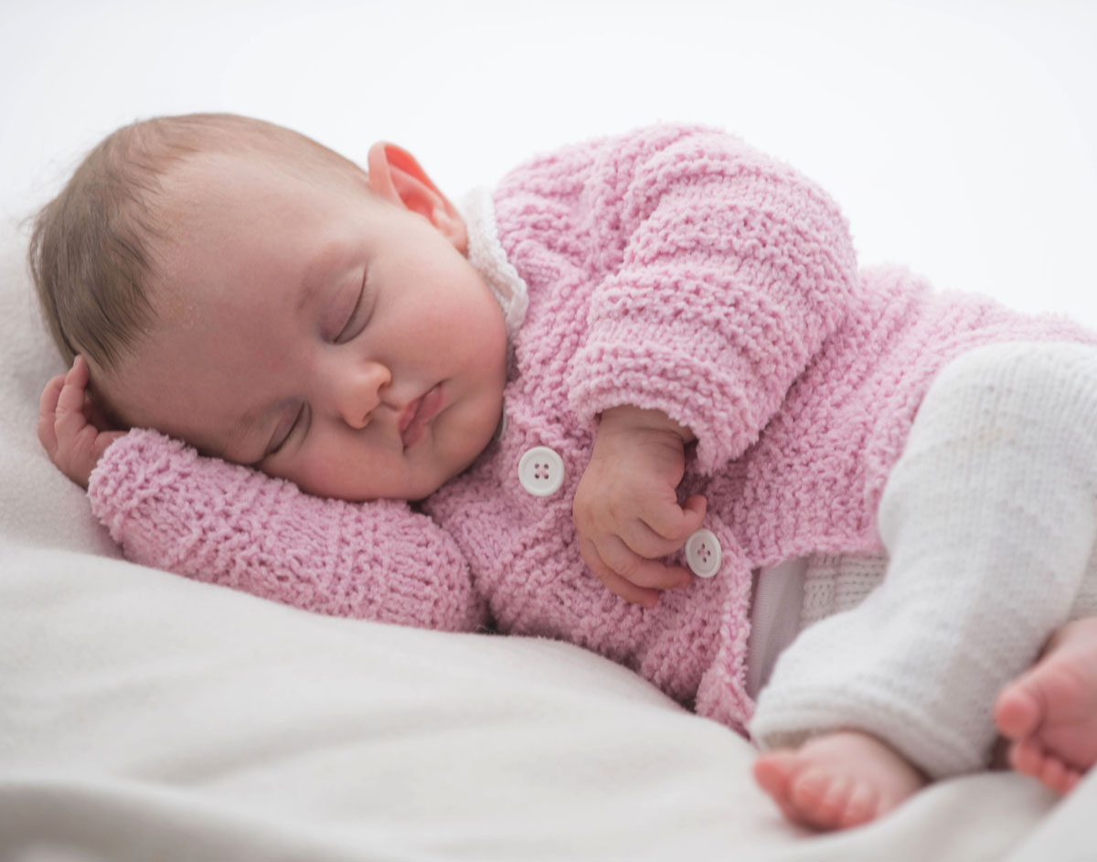 Lana Grossa Baby Soft (60 % Polyamid, 40 % Baumwolle, Lauflänge 150 m/50 g) 100 g Zartpink (Fb 6) und Elastico (96 % Baumwolle, 4 % Polyester, Lauflänge 160 m/50 g) 50 g Weiß (Fb 1); Stricknadeln Nr. 3,5, eine 40 cm lange Rundstricknadel Nr. 3,5; vier Knöpfe mit 15 mm Ø.
