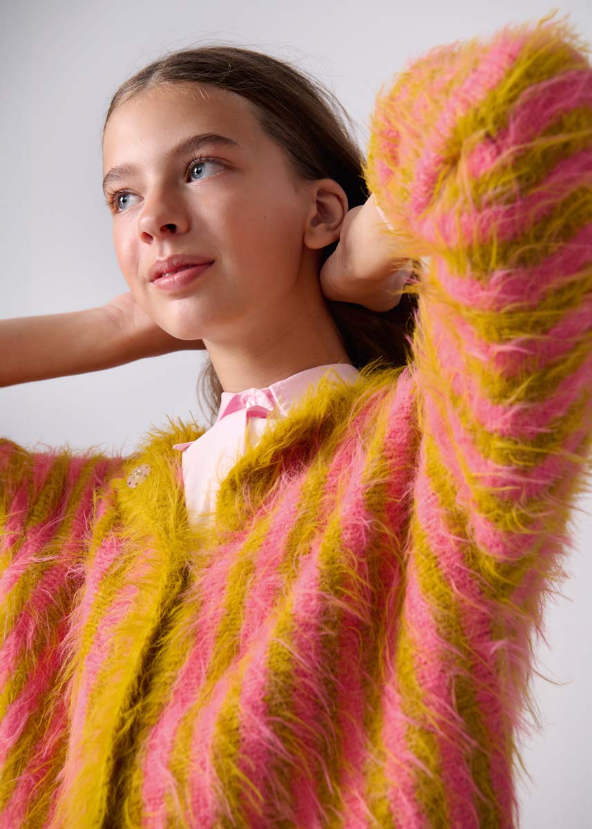 Lana Grossa-Qualität „Basta“ (50% Schurwolle (Merino), 50% Polyamid, LL = ca 100 m/50 g): ca 150 (200 - 200 - 200) g Bonbonrosa (Fb 8) und ca 200 (200 - 250 - 250) g Senfgelb (Fb 12); Stricknadeln Nr 4,5 und 5,5; kurze Rundstricknadel Nr 4,5; 5 Druckknöpfe in passender Farbe, Durchmesser ca 20 mm.
