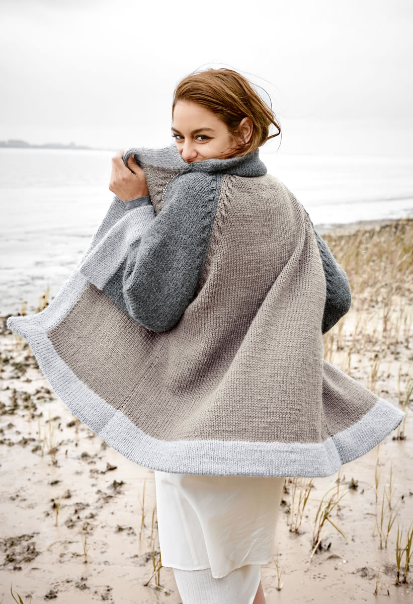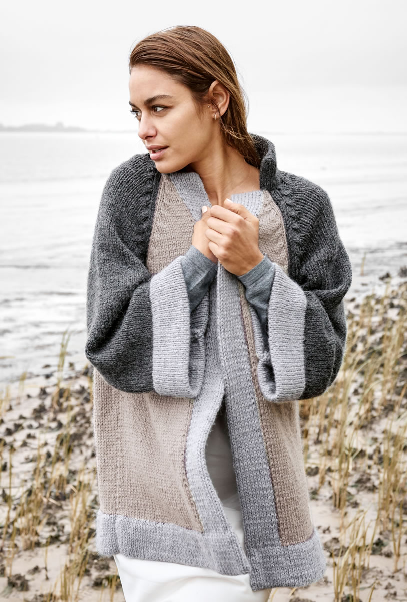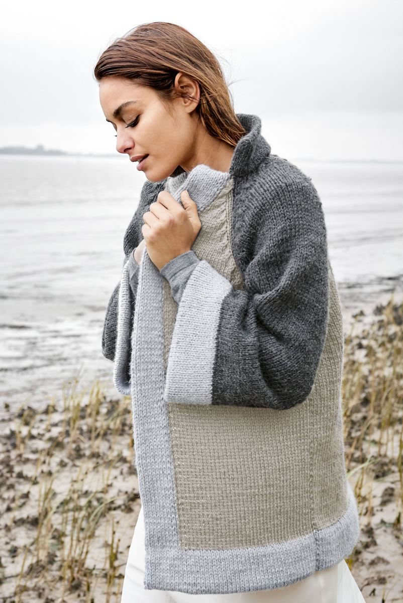 Lana Grossa Bingo Alpaca (70 % Schurwolle, 30 % Alpaka, Lauflänge 70 m/50 g) 350 (400-450) g Grau (Fb 12), 300 (350-400) g Graubraun (Fb 6) und 300 (350-400) g Anthrazit (Fb 13); Stricknadeln Nr. 5,5, eine 40 cm lange Rundstricknadel Nr. 5,5