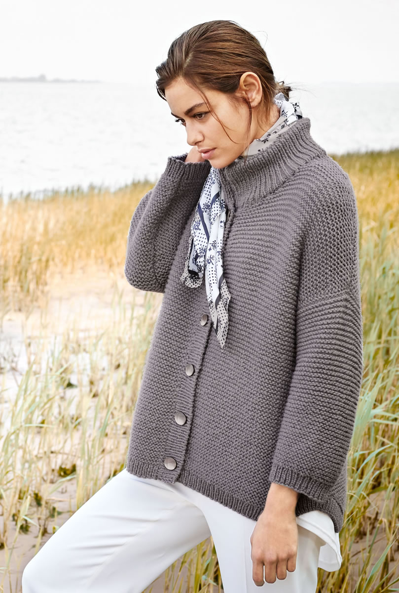 Der Trend steckt im Detail! Stehkragen und überschnittene 7/8-Ärmel schenken der kastig gestrickten Jacke elegante Lässigkeit.