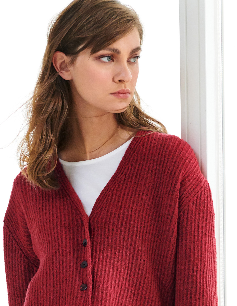 Lana Grossa Cashmere 16 Fine (80% Schurwolle, 10% Kaschmir, 10% Polyamid, Lauflänge 320 m/50 g) 300 (350 – 400) g Rot (Fb 22); Stricknadeln Nr. 4,5, 4 Knöpfe von UNION KNOPF, Art. 46286, Fb 22, Gr. 15 mm.