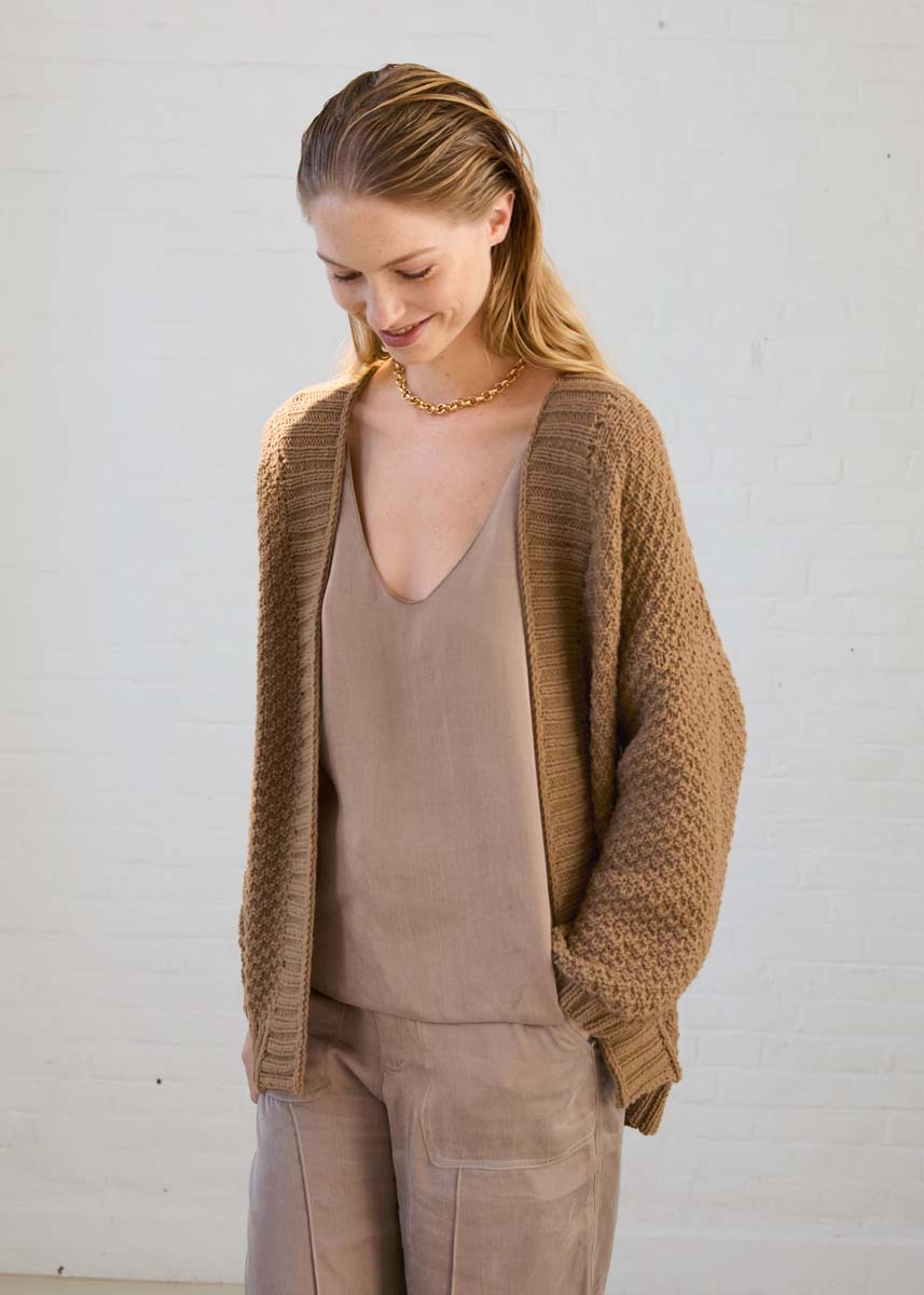 Lana Grossa Cashmere Kiss (70% Schurwolle (Merino superfein), 30% Kaschmir, Lauflänge 70 m/25 g), 550 (575 - 600) g Camel (Fb. 101); Stricknadeln Nr. 5 und 5,5, sowie 1 Rundstricknadel Nr. 5, 120 cm lang.