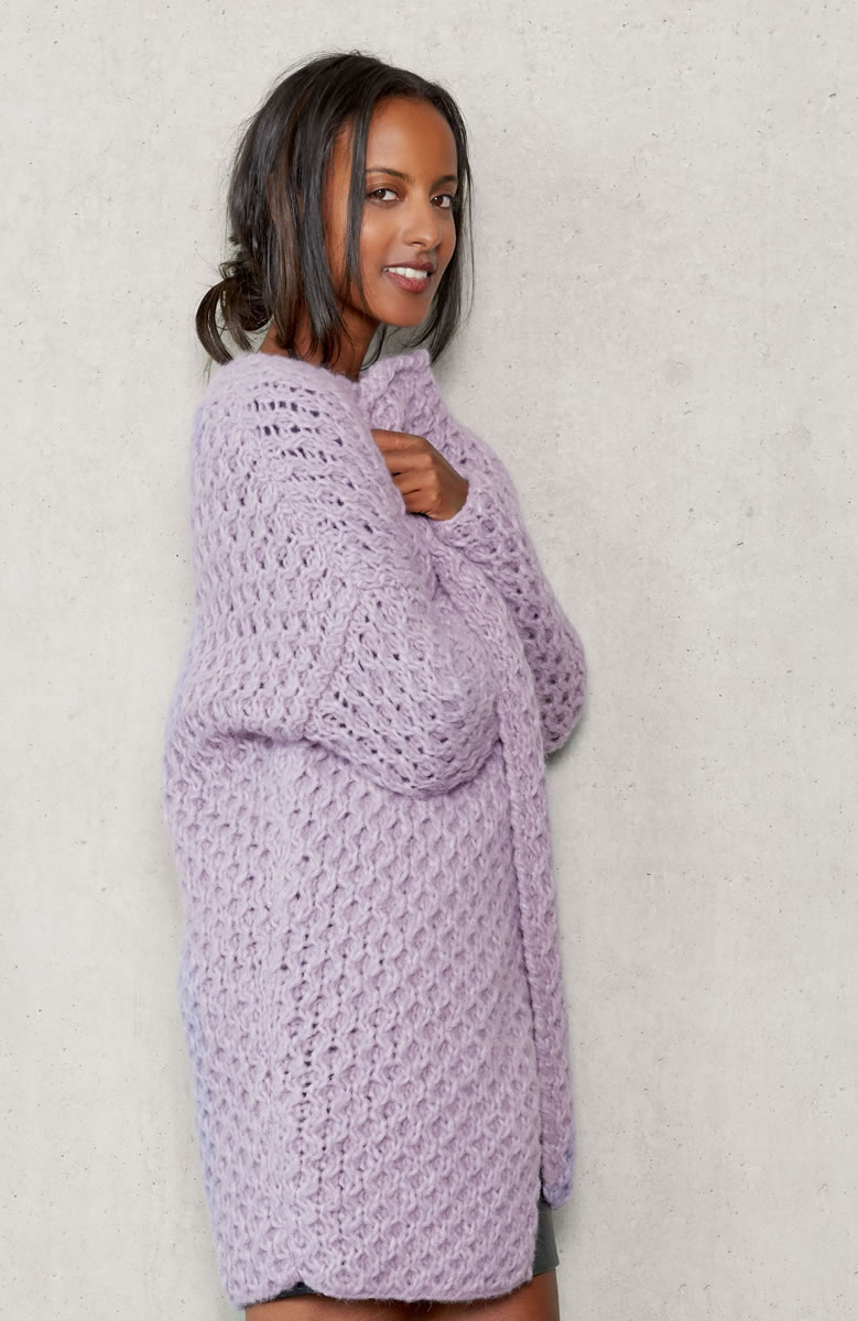 Lana Grossa Cloud (80 % Alpaka, 14 % Schurwolle, 6 % Polyamid, Lauflänge 80 m/50 g) 550 (600/650) g Flieder (Fb 9); Stricknadeln Nr. 9, Häkelnadel Nr. 8.