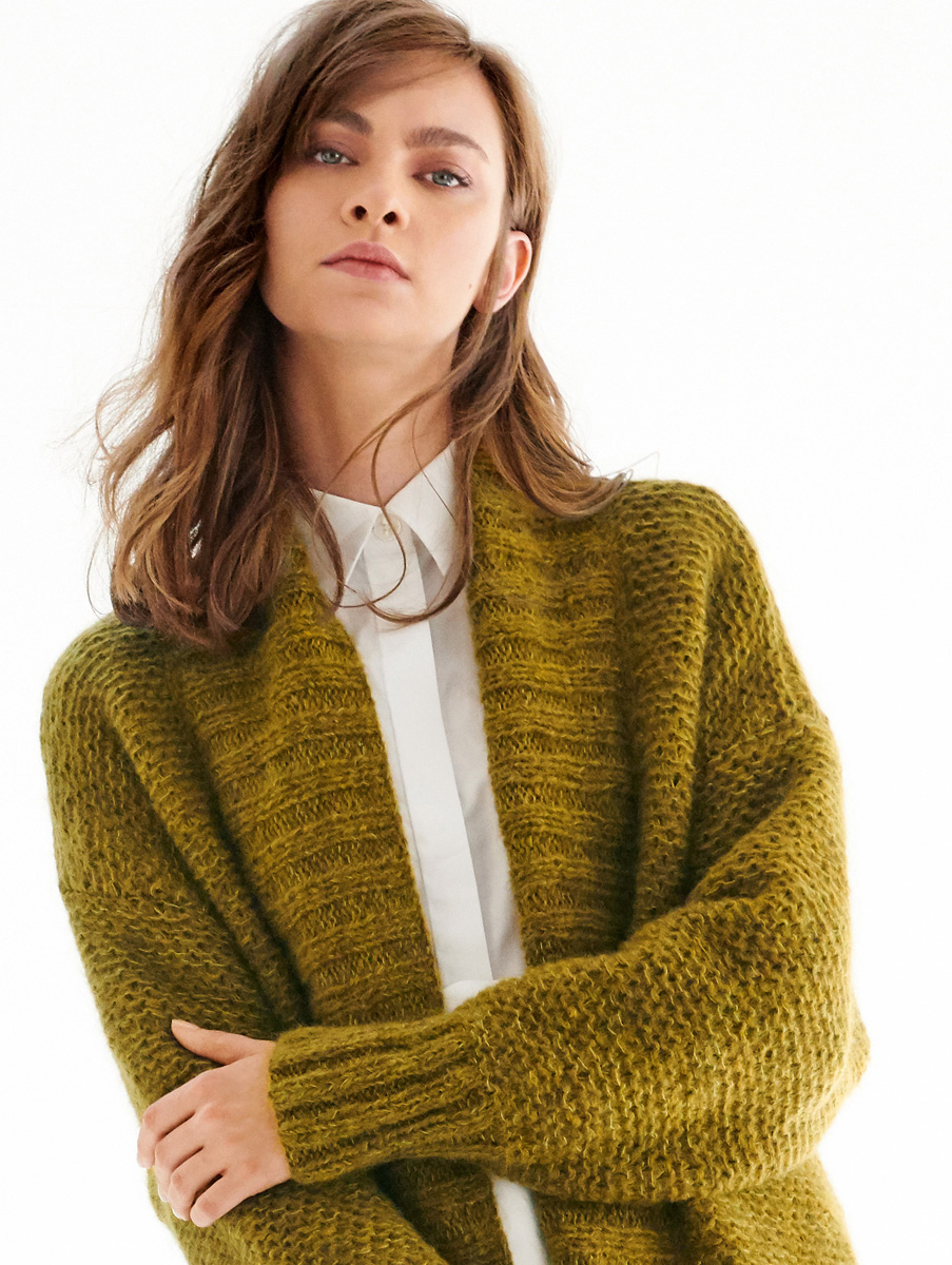 Lana Grossa Cool Air Fine (50% Schurwolle Merino, 28% Baby Alpaca, 22% Polyacryl, Lauflänge 240 m/50 g), 450 (500 – 550 – 600) g Oliv (Fb 21) und Lana Grossa Silkhair (70% Mohair, 30% Seide, Lauflänge 210 m/25 g), 200 (225– 225– 250) g Helloliv (Fb 108); Stricknadeln Nr. 5 und 6, 1 Rundstricknadel Nr. 5, 120 cm lang und 1 Häkelnadel Nr. 4,5.