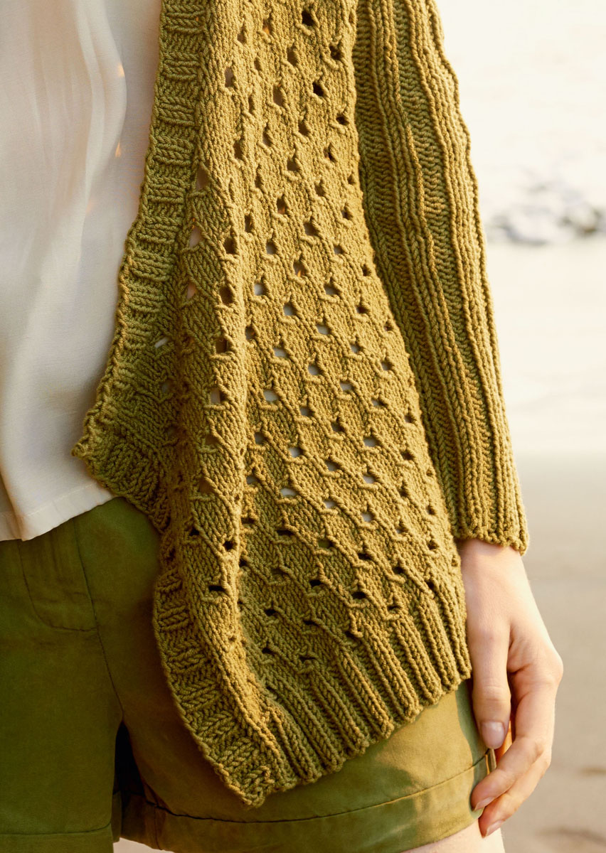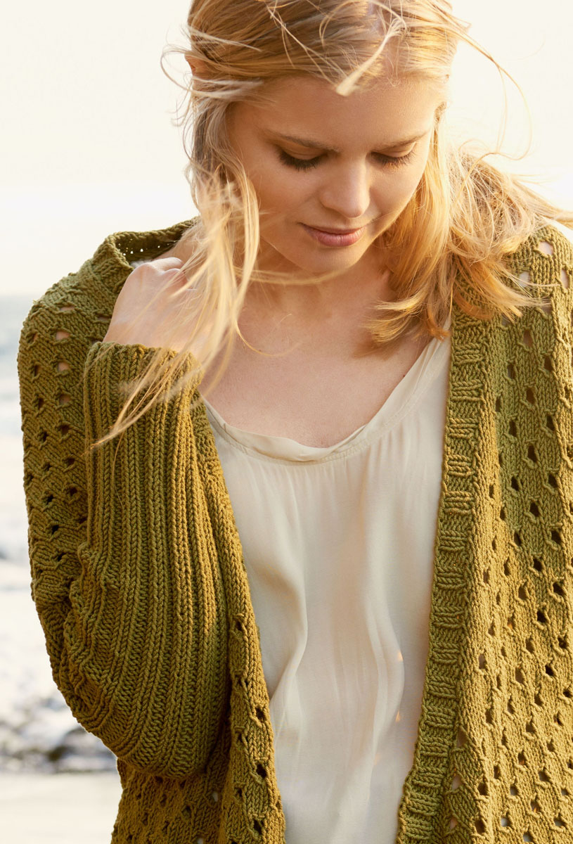 Lana Grossa Cool Cotton (93% Baumwolle, 7% Elité, Lauflänge 105 m/50 g), 600 (650 – 700) g Oliv (Fb 12); Stricknadeln Nr. 5 und 6, 1 Rundstricknadel Nr. 5, 100 cm lang.