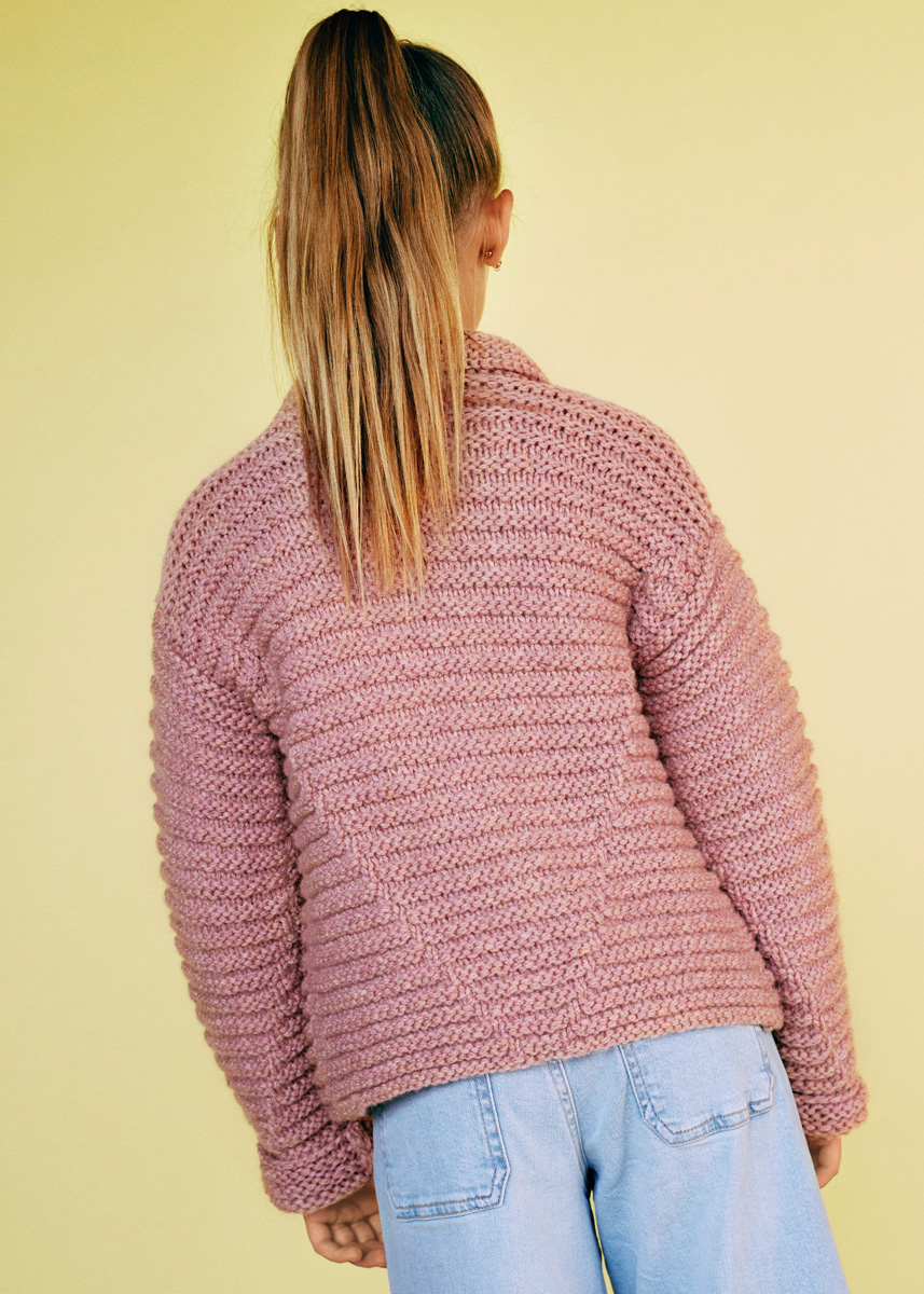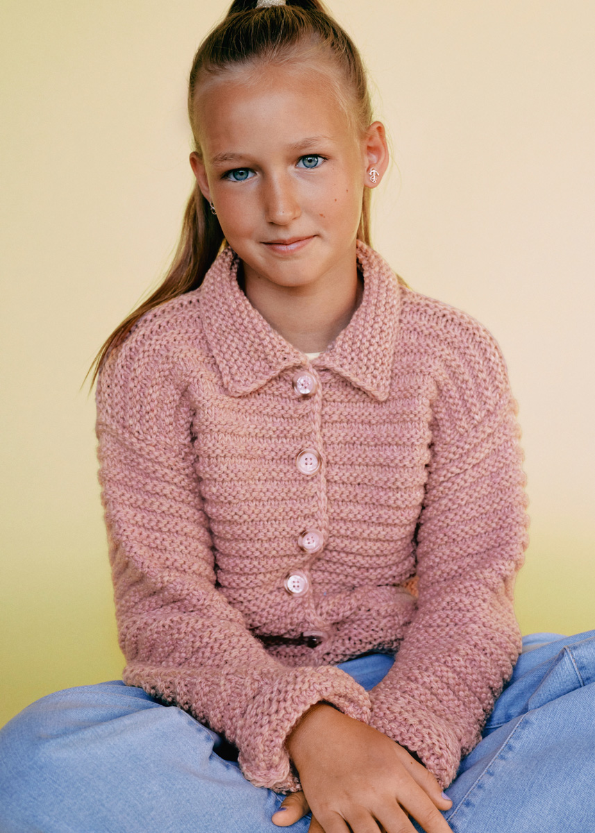 Lana Grossa Cool Merino Big (90% Schurwolle (Merino), 10% Polyamid, Lauflänge 90 m/50 g), 450 (500 – 550) g Rosa (Fb. 227); Stricknadeln Nr. 7, 1 Rundstricknadel Nr. 6, 40 cm lang, 1 Häkelnadel Nr. 4,5 und 6 Knöpfe von UNION KNOPF, Art. 454230, Fb. 46, Ø 23 mm.