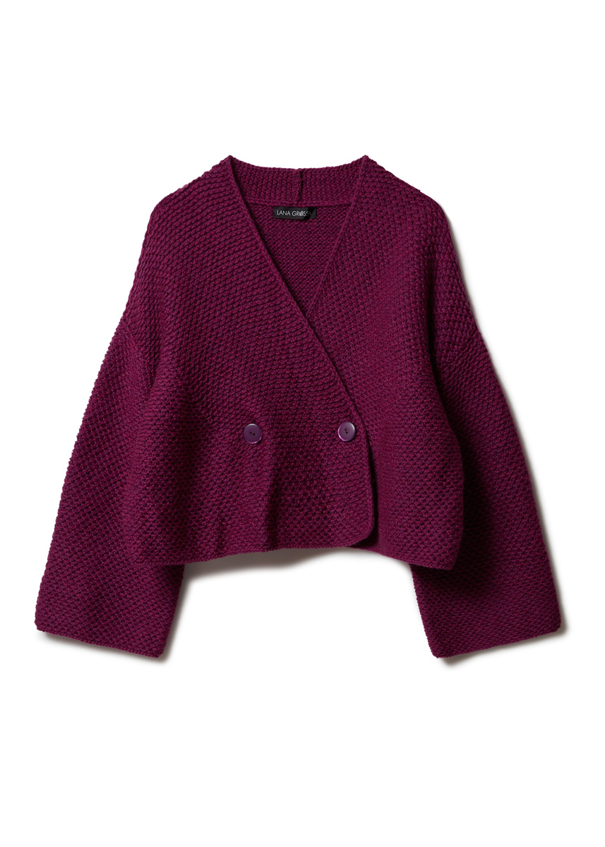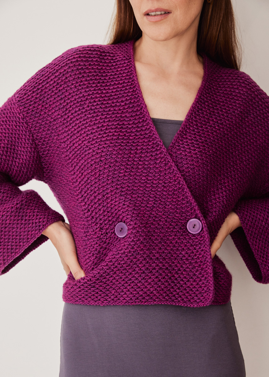 Lana Grossa Cool Merino (90% Schurwolle (Merino), 10% Polyamid, Lauflänge 150 m/50 g), 450 (500 – 550) g Fuchsia (Fb. 2); Stricknadeln Nr. 5 und 2 Knöpfe von UNION KNOPF, Fb. Fuchsia, Ø 28 mm.