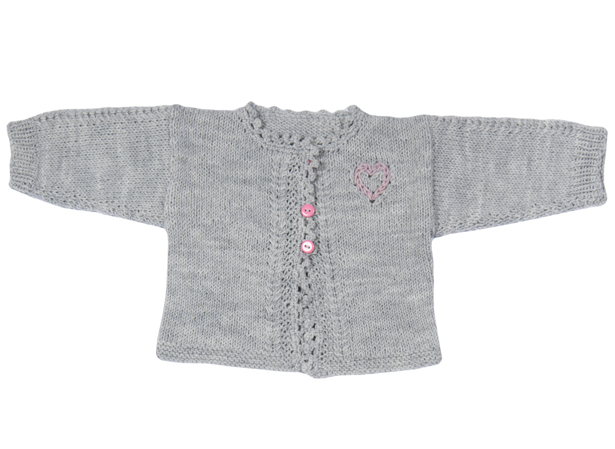 Lana Grossa Cool Wool Baby (100 % Schurwolle, Lauflänge 220 m/50 g) 50 (100) g Hellgrau (Fb 241) und 50 g Rosa (Fb 216); Stricknadeln Nr. 3, Häkelnadel Nr. 2,5; 3 Knöpfe mit 10 mm Ø.