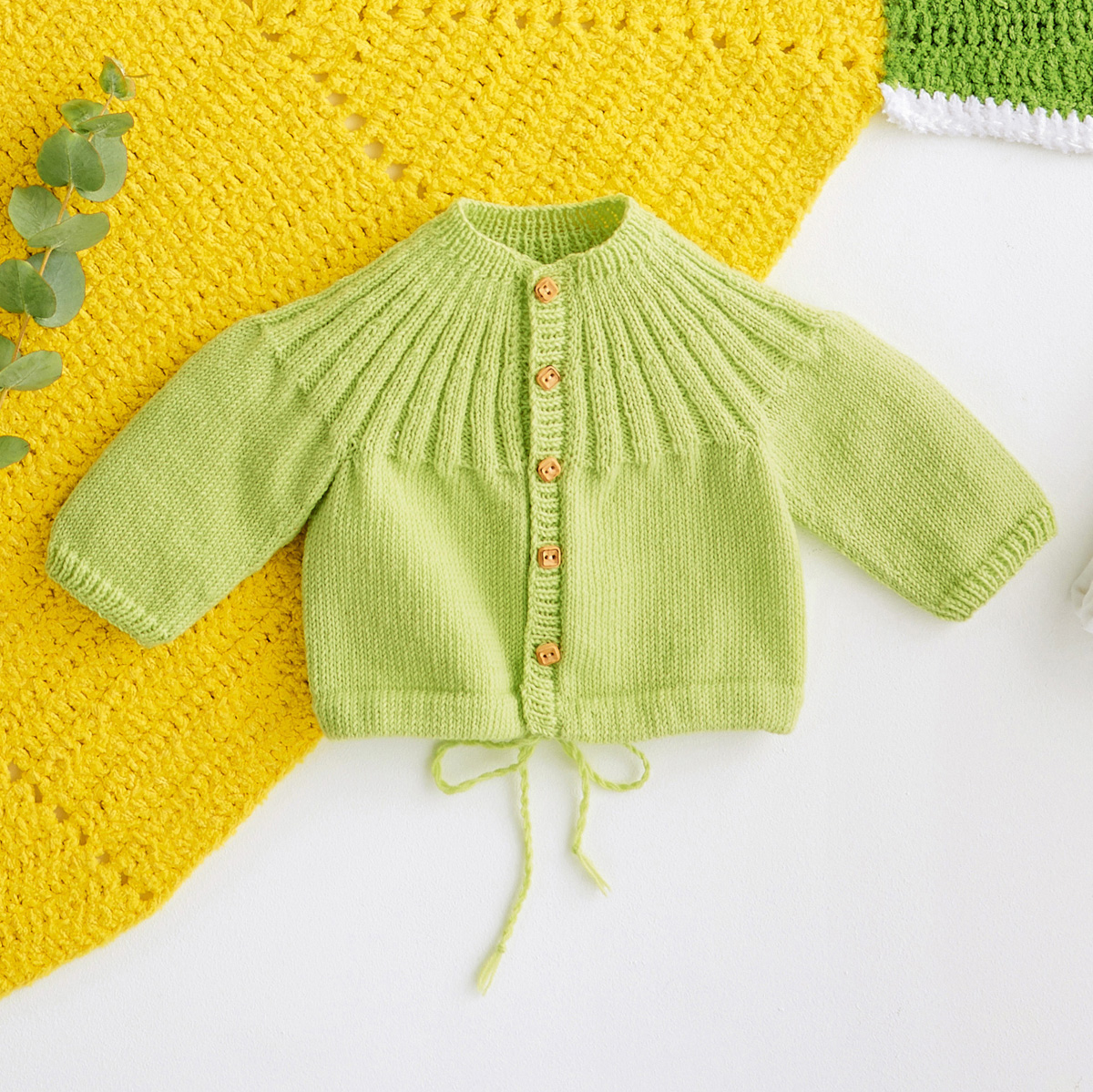 Lana Grossa Cool Wool Baby (100 % Schurwolle (Merino extrafine), Lauflänge 220 m/50 g) 100 (100/150/150) g Limette (Fb 228); Rundstricknadeln Nr. 2,5 und 3; fünf (fünf/fünf/sechs) Knöpfe mit 10 mm Ø.