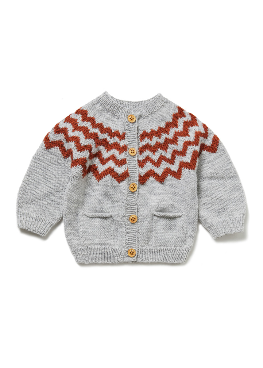 Lana Grossa-Qualität „Cool Wool Baby“ (100 % Schurwolle (Merino extrafein); Lauflänge = 220 m/50 g): 100 (100/150/ 150) g Hellgrau meliert (Fb 206) und 50 g Rost (Fb 291); je eine Rundstricknadel 2,5 mm und 3 mm; je ein Nadelspiel 2,5 mm und 3 mm; Maschenmarkierer; 5 (5/6/6) Knöpfe mit 13 mm Ø.