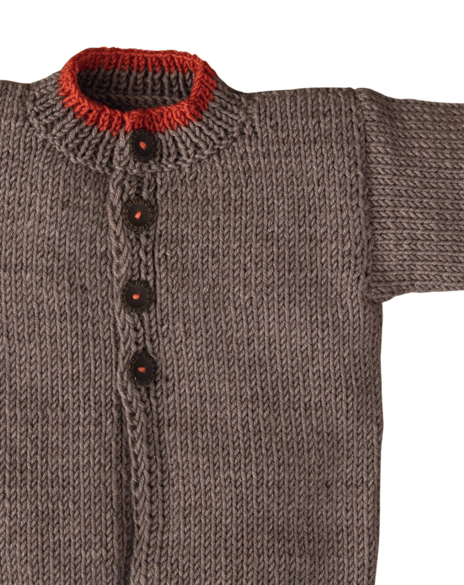 Lana Grossa Cool Wool Big Mélange (100 % Schurwolle, Lauflänge 120 m/50 g) 150 g Graubraun meliert (Fb 315) und Cool Wool Baby (100 % Schurwolle, Lauflänge 220 m/50 g) 50 g Tomate (Fb 271); Stricknadeln Nr. 4, eine 40 cm lange Rundstricknadel Nr. 4; vier Knöpfe mit 15 mm Ø.