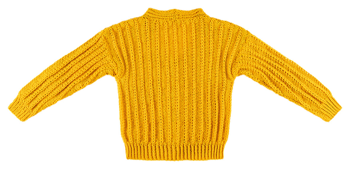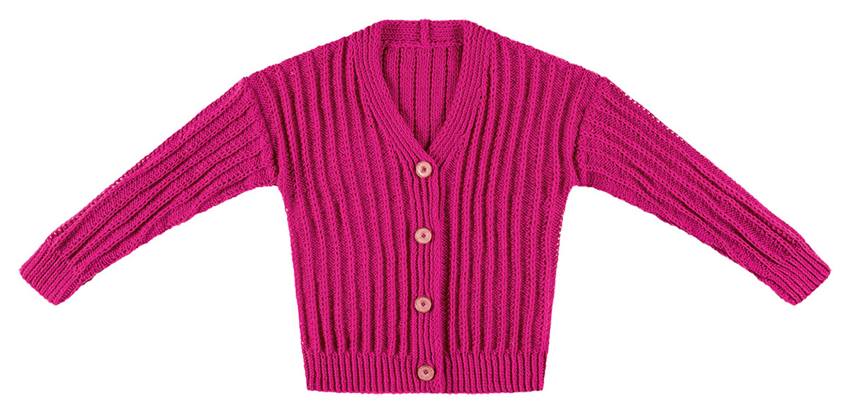 Lana Grossa Cool Wool (100% Schurwolle, Lauflänge 160 m/50 g), 200 (250 – 300 – 350) g Goldgelb (Fb 2005) oder Zyklam (Fb 537); Stricknadeln Nr. 3 und 3,5, 4 Knöpfe von UNION KNOPF, Fb Braun oder Rosa, Gr. 20 mm.