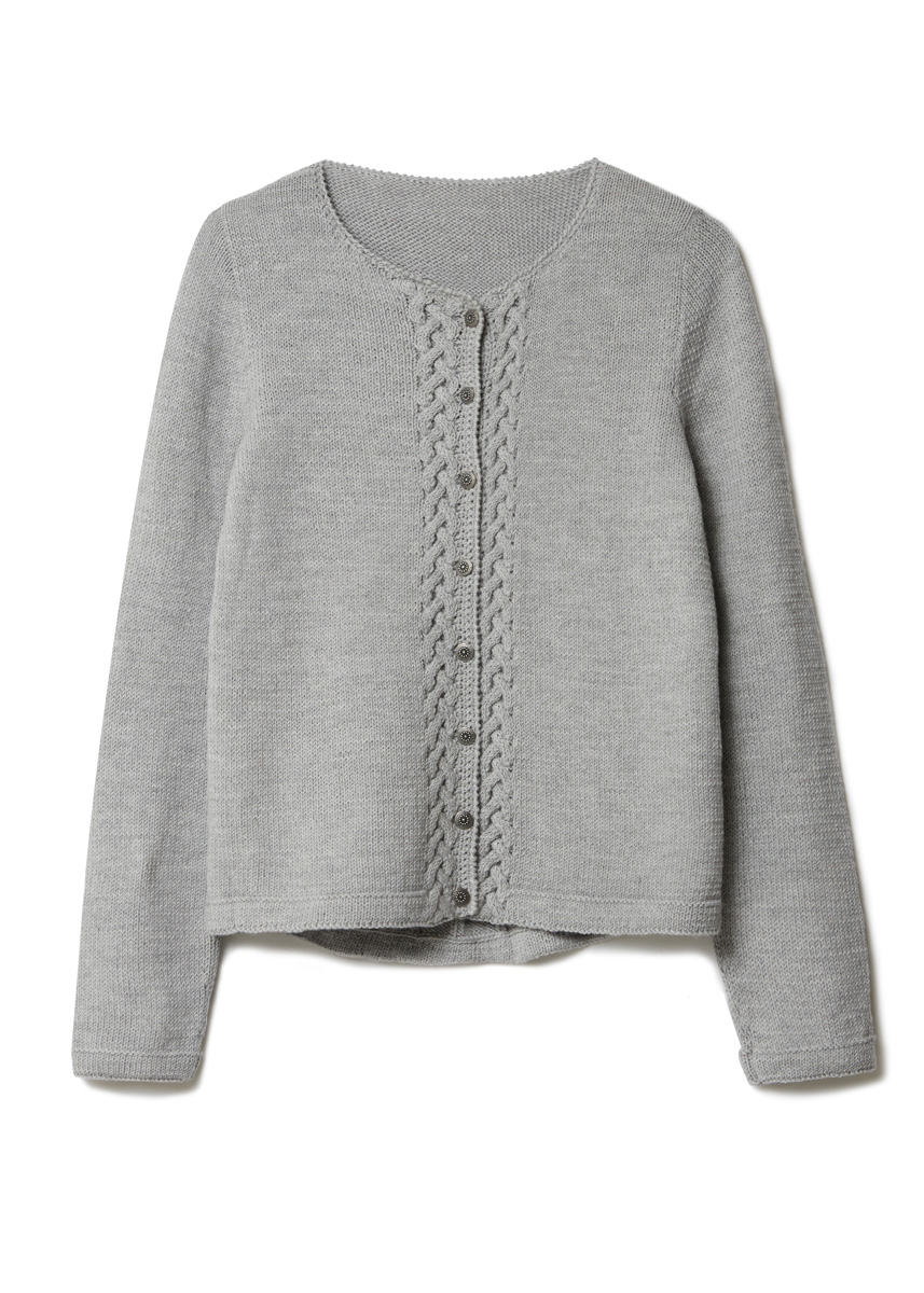Die tiefe Kellerfalte im Rückenteil verleiht dieser Jacke eine dirndlfreundliche A-Silhouette. Vorderteile und Falteneinsatz sind mit Zopfmustern garniert. Abgerundet wird das Schmuckstück von silbernen Knöpfen und doppelt gearbeiteten Säumen.