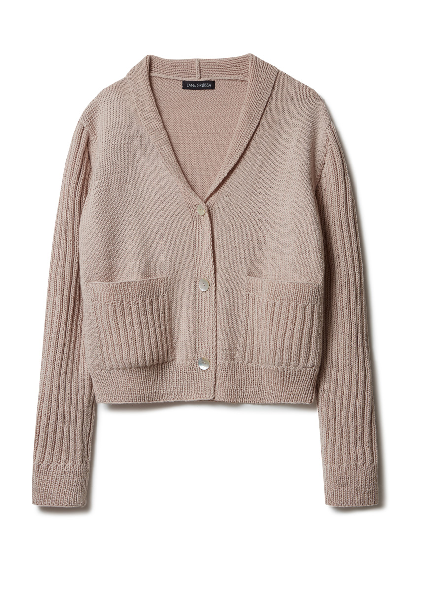 Lana Grossa Cool Wool Seta (80% Schurwolle (Merino extrafein), 20% Seide, Lauflänge 160 m/50 g), 450 (500 – 550) g Beige (Fb. 15); Stricknadeln Nr. 2,5 und 3, sowie 3 Knöpfe von UNION KNOPF, Art. 37604, Fb. 12, Ø 20 mm.