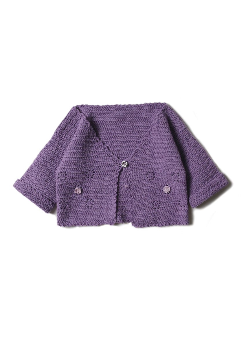 Lana Grossa Cotton Love (100 % Baumwolle (Bio), Lauflänge = 170 m/50 g): 100 (100/150) g Viola (Fb 16) und Ecopuno (72 % Baumwolle, 17 % Schurwolle (Merino), 11 % Alpaka (Baby), Lauflänge = 215 m/50 g): 50 g Flieder (Fb 8); Häkelnadel Nr. 3,5 und Nr. 2,5; ein Knopf mit 13 mm Ø.