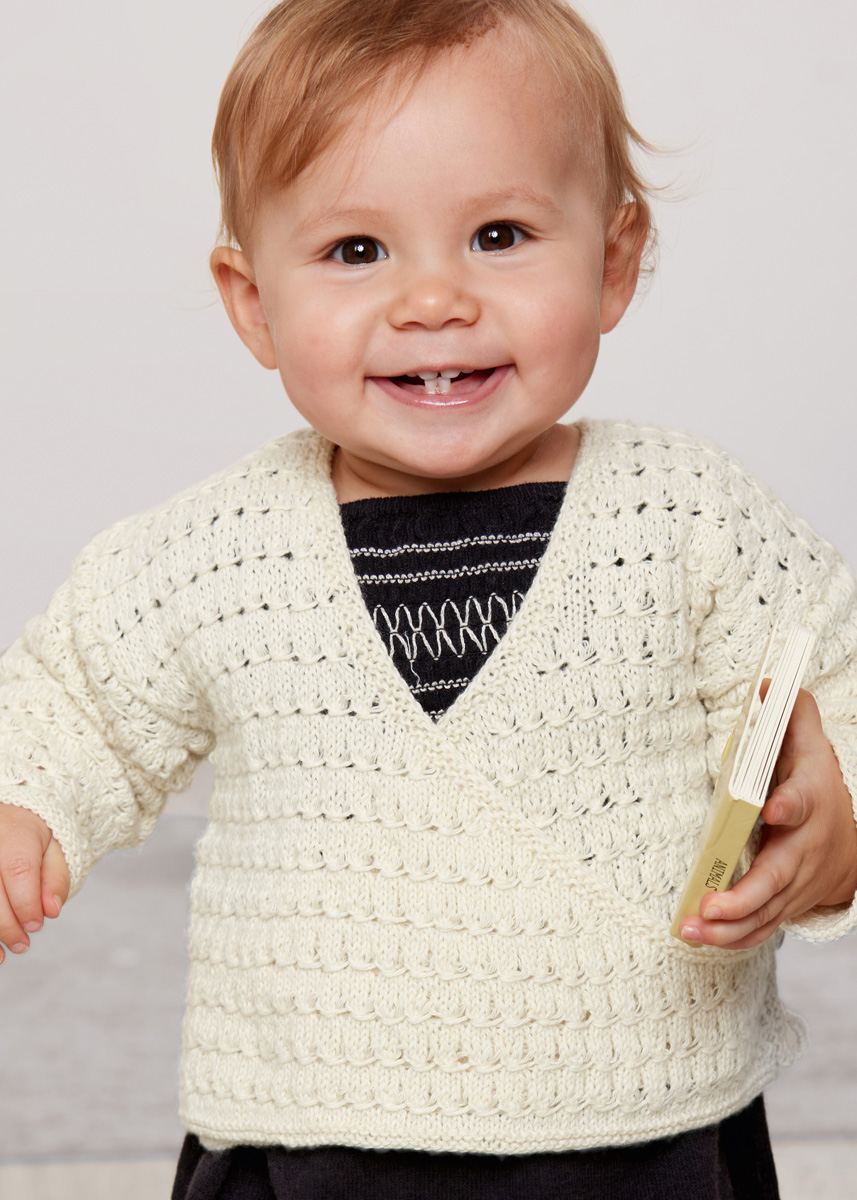 Lana Grossa Cotton Love (100 % Baumwolle (Bio), Lauflänge = 170 m/50 g): 100 (100/150) g Beige (Fb 18); Stricknadeln Nr. 3,5; Rundstricknadel Nr. 3,5; Zopfnadel; Häkelnadel Nr. 3; je zwei Knöpfe mit 11 mm Ø und 15 mm Ø.