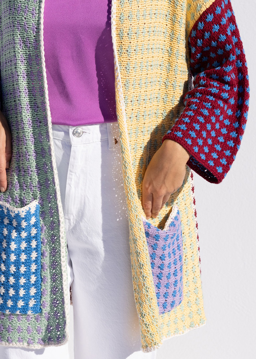 Lana Grossa-Qualität „Dodici” (65 % Baumwolle, 25 % Viskose, 10 % Leinen, LL = ca. 110 m/50 g): ca. 250 (300) g in Creme (Fb. 2), 150 (200) g in Dunkelrot (Fb. 7), je 100 (150) g in Fliederlila (Fb. 9) und Lindgrün (Fb. 15), 100 (100) g in Gelb (Fb. 3) und 50 (50) g in Blau (Fb. 12); 1 Rundstricknadel Nr. 4, 100 cm lang, 1 Häkelnadel Nr. 4.