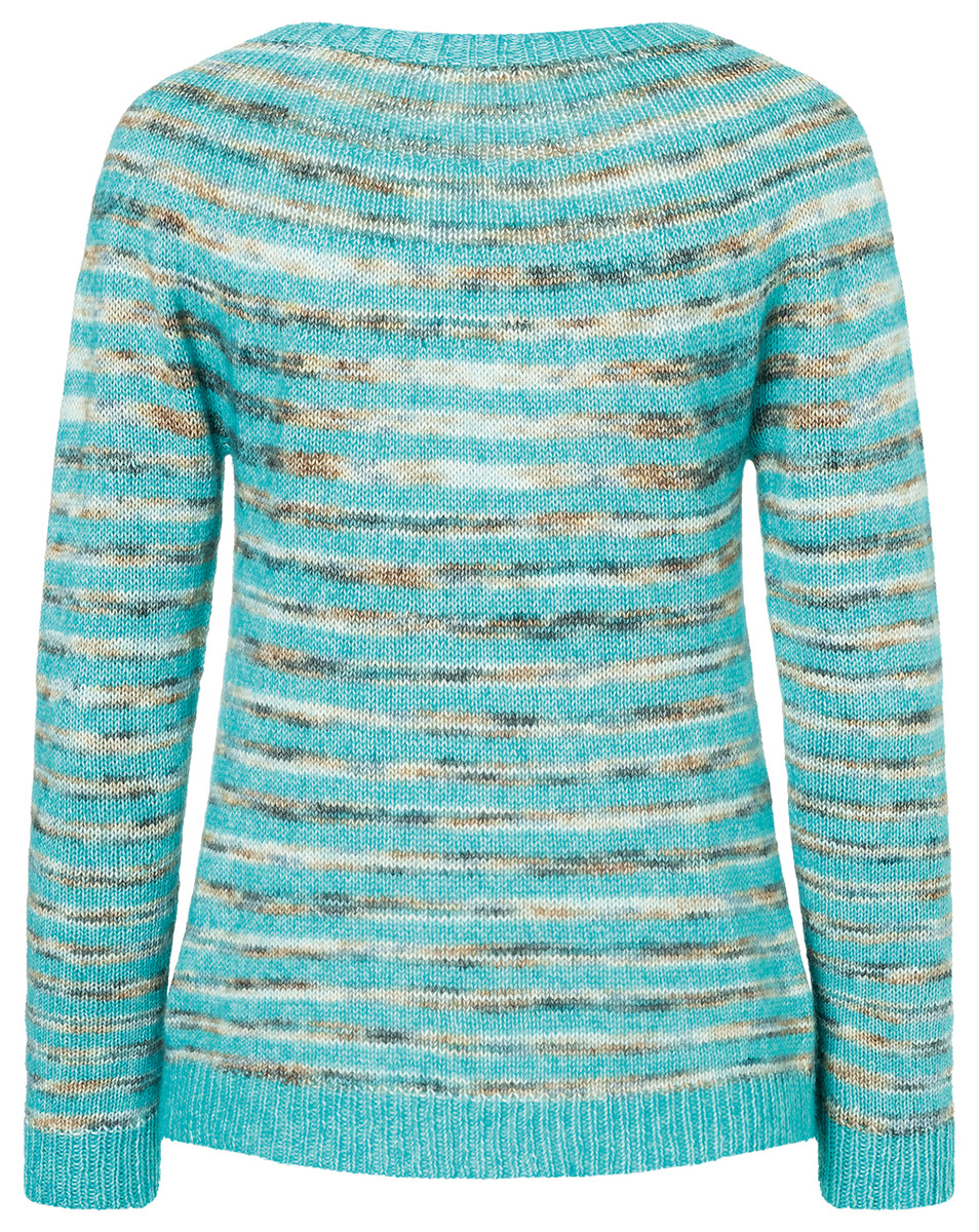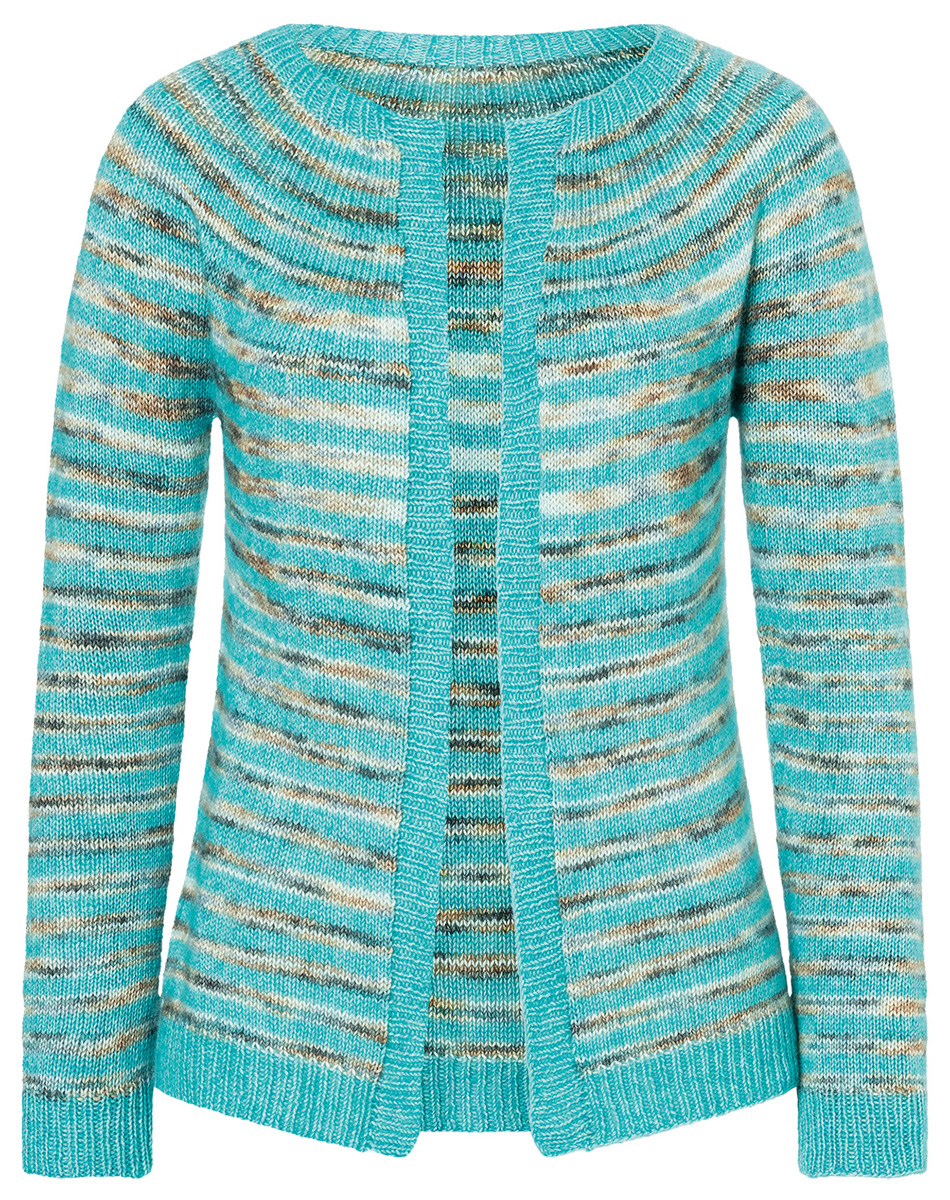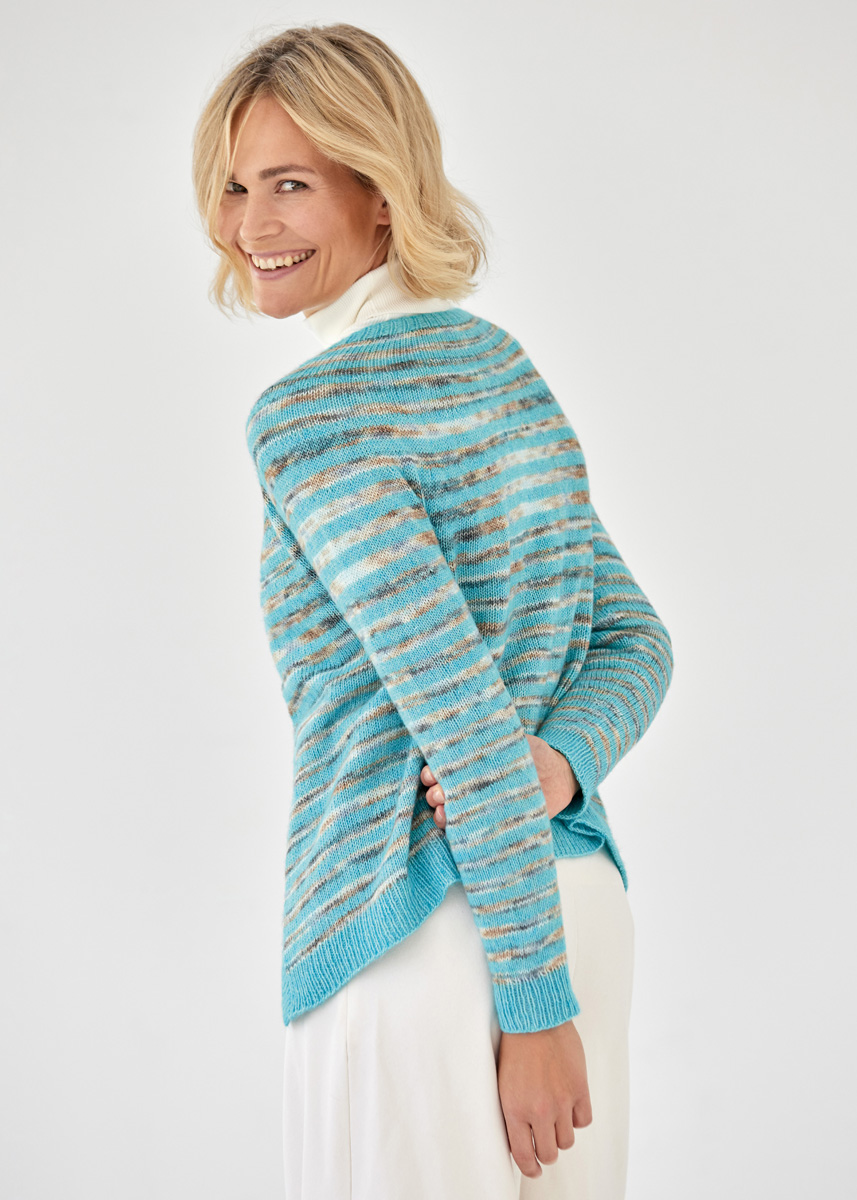 Unser Traum in Türkis wird in Runden, am Stück und top down (von oben nach unten) gestrickt. Das Tolle daran: Lästige Nähte gibt es nicht. Obendrein kann man das Modell zwischendurch anprobieren und Rumpfwie Ärmellängen beliebig variieren.