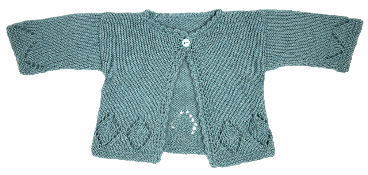 Lana Grossa Ecopuno (72 % Baumwolle, 17 % Schurwolle, 11 % Alpaka, Lauflänge 215 m/50 g) 100 g Minttürkis (Fb 44); Stricknadeln Nr. 3,5; Häkelnadel Nr. 3; ein Knopf mit 13 mm Ø.