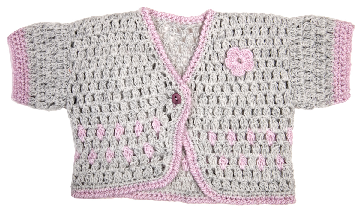 Lana Grossa Ecopuno (72 % Baumwolle, 17 % Schurwolle, 11 % Alpaka, Lauflänge 215 m/50 g) 50 (100/100) g Hellgrau (Fb 14) und 50 g Flieder (Fb 8); Häkelnadel Nr. 4; ein Knopf mit 13 mm Ø.