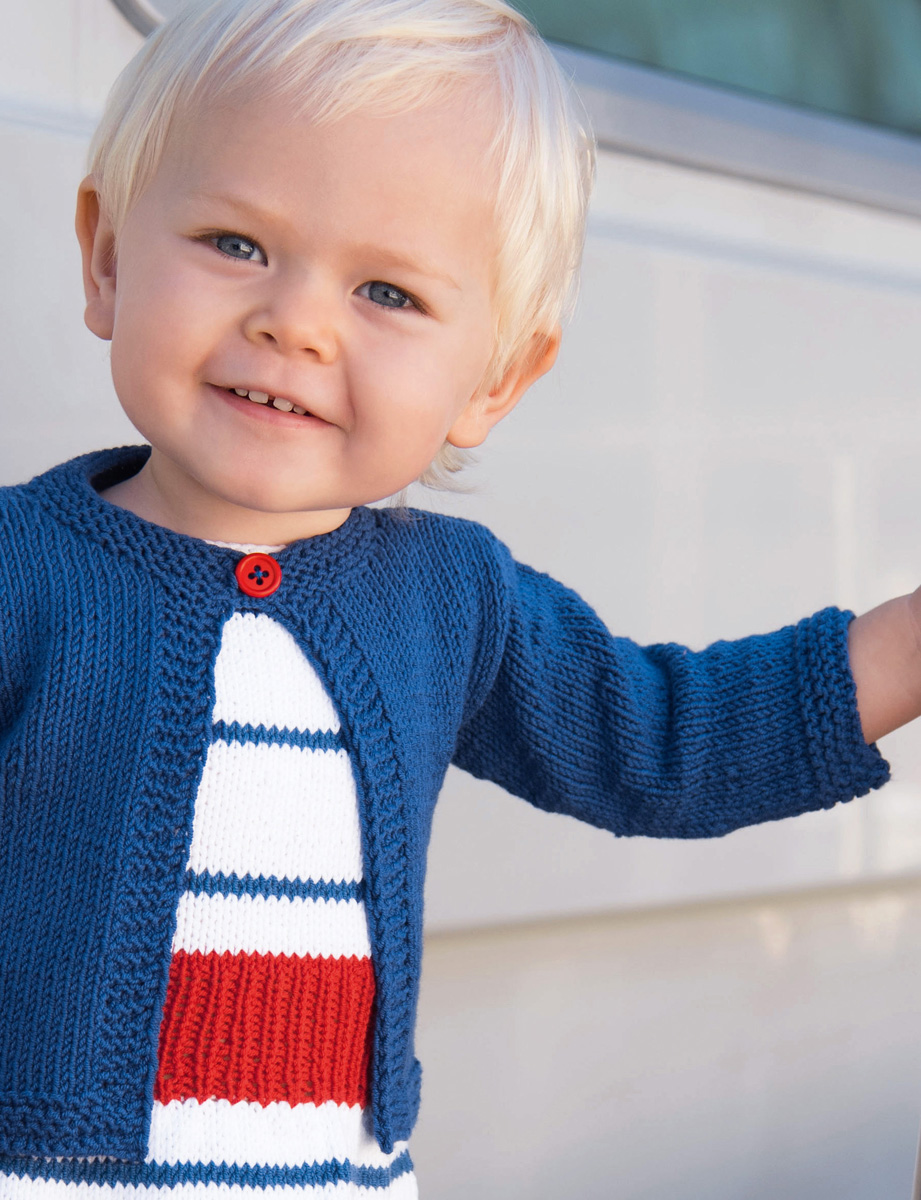 Lana Grossa Elastico (96 % Baumwolle, 4 % Polyester, Lauflänge 160 m/50 g) 100 (100/150) g Royal (Fb 114); Stricknadeln Nr. 4, eine 40 cm lange Rundstricknadel Nr. 4, Häkelnadel Nr. 3,5; ein Knopf mit 15 mm Ø.